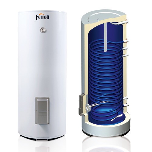 Выпускаемый в Китае водонагреватель косвенного нагрева Ferroli Ecounit F 1C представляет собой высокопроизводительный прибор, оснащенный встроенным ТЭНом на 1,5 кВт и одной вытянутой спиралью, которой хватает для охвата нужной для прогрева части резервуара. Бак устройства изготовлен из стали, его внутренняя поверхность надежно защищена покрытием из голубого стеклофарфора. Агрегат способен прогревать воду до 95°С при максимально допустимом давлении 8 Бар. Он оснащен ABS термометром, магниевым анодом, расположенным на большом фланце.