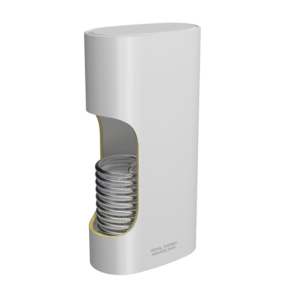 Российский водонагреватель Royal Thermo AQUATEC INOX RTWX-F – настенная модель плоской формы, рассчитанная на комбинированный нагрев 80/100 л воды. Бак и теплообменник прибора выполнены из нержавейки, содержащей легирующие элементы для предотвращения образования коррозии. Также он оснащен встроенным медным ТЭНом, позволяющим регулировать нагрев от 30 до 75°С. Универсальный и простой монтаж позволит вписать устройство даже в интерьер небольшого помещения.