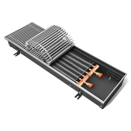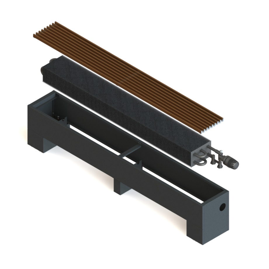 Внутрипольные конвекторы Techno Usual KVZ представляют собой отопительные приборы с естественной конвекцией и могут монтироваться как в жилых, так и офисных помещениях. В случае необходимости есть возможность самостоятельно дооснастить их тангенциальными вентиляторами. Приборы можно устанавливать в центральные и автономные, однотрубные и двухтрубные отопительные системы. Хорошо себя зарекомендовали в системах с принудительной циркуляцией теплоносителя. Корпус устройств имеет дополнительные ребра жесткости и изготавливается из 1, 2 мм листовой оцинкованной стали высокого качества и покрывается порошковым полиэфиром. Теплообменник производится из медной цельногнутой трубы, а его ламели – из алюминия. В комплект входит рулонная либо продольная декоративная решетка из анодированного алюминия или дерева.