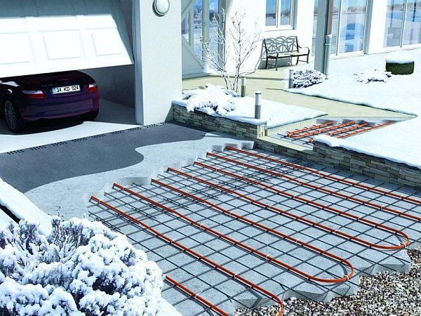 Для обогрева площадок открытого типа применяется специальный бронированный кабель, укладываемый под финишное покрытие. Греть таким образом можно ступени зданий, эстакады, сложные съезды, остановки, места большого скопления людей, предотвращая появление обледенения на них. Такая система позволяет в разы снизить получение травм, аварийность на дорогах. Также она значительно продляет срок службы асфальта, других видов покрытия, т.к. отпадает надобность в регулярной механической их очистке от снега и льда.