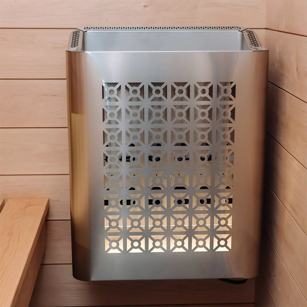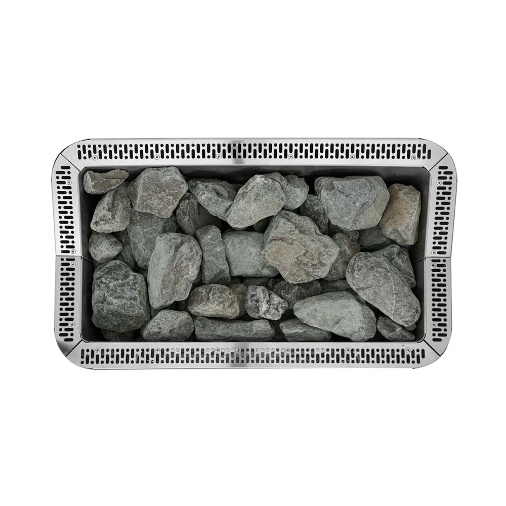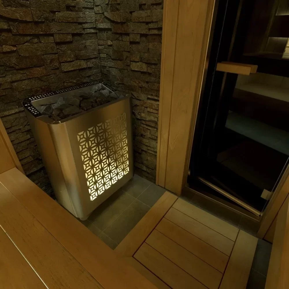 На передней части кожуха есть сетка со специальным паттерном, за ней находится встроенная подсветка, которая включается во время работы ТЭНов. Так создается реалистичная имитация тлеющих углей, как при использовании традиционной дровяной печи, что безусловно, добавляет парной особого уюта. Подсветка не только выполняет декоративную функцию, но и служит индикатором включения и выключения ТЭНов. Когда печь нагревает помещение до нужной температуры, подсветка автоматически выключается, что делает процесс использования каменки более интуитивным.