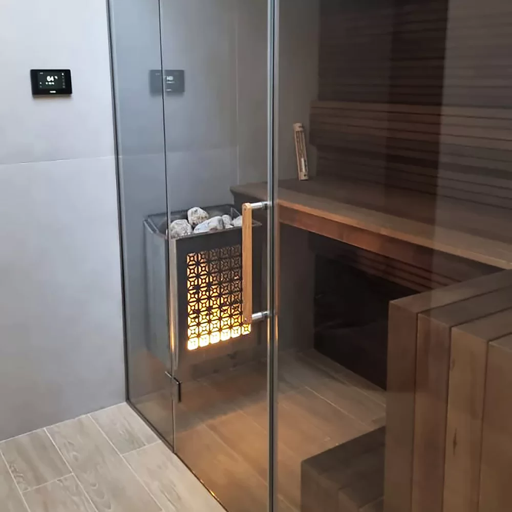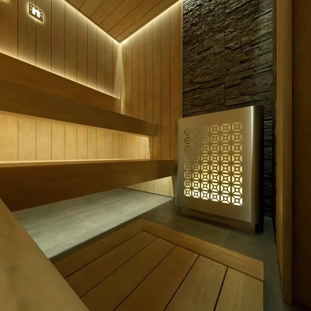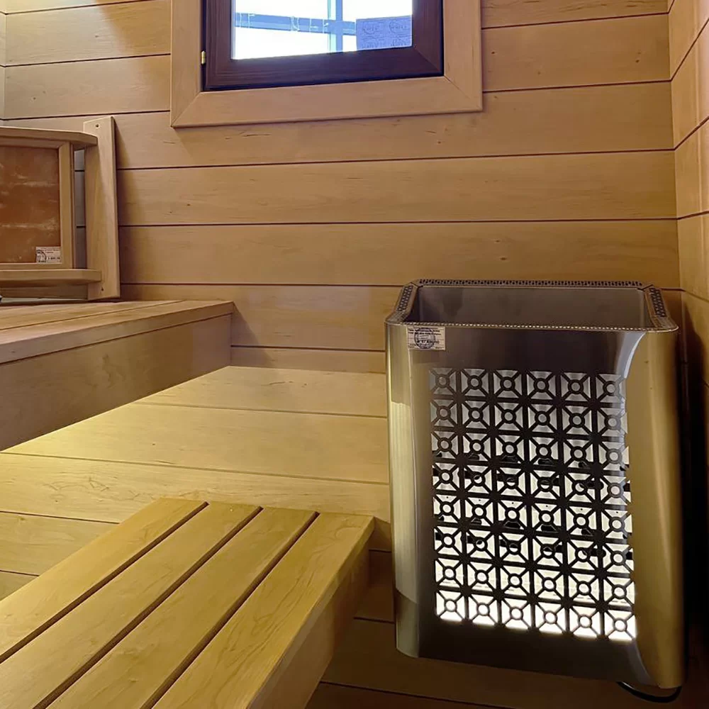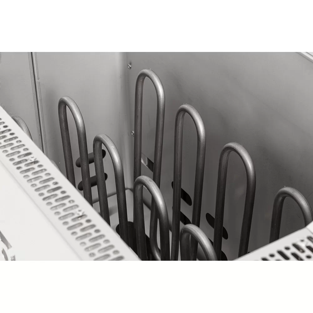 На передней части кожуха есть сетка со специальным паттерном, за ней находится встроенная подсветка, которая включается во время работы ТЭНов. Так создается реалистичная имитация тлеющих углей, как при использовании традиционной дровяной печи, что безусловно, добавляет парной особого уюта. Подсветка не только выполняет декоративную функцию, но и служит индикатором включения и выключения ТЭНов. Когда печь нагревает помещение до нужной температуры, подсветка автоматически выключается, что делает процесс использования каменки более интуитивным.