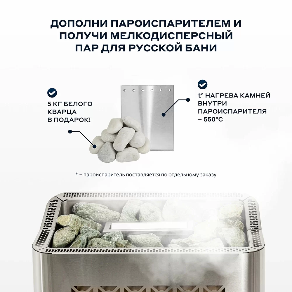 Компактная, создающая дополнительный уют за счет подсветки, и единственная среди подвесных каменок, fire вмещает в себя 40 кг камней, что позволяет ей быстрее прогревать парную и наполнять ее мягким, не обжигающим жаром.