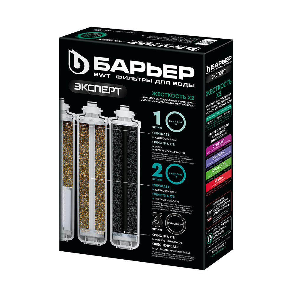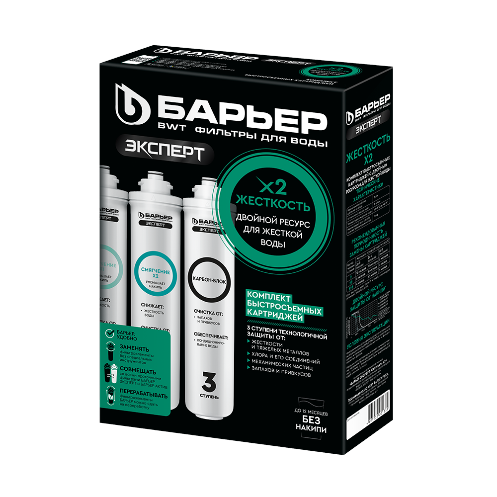 Комплект сменных картриджей способен удалить из состава жесткой воды все присутствующие в ней основные вредные примеси. Уникальная разработка позволяет продлить ресурс вашей системы в 2 раза. Фильтроэлементы необходимо использовать только в системах холодного водоснабжения. Подходит ко всем фильтрам линейки БАРЬЕР Эксперт.