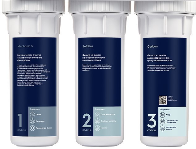 Система фильтрации для жесткой воды с высоким содержанием солей. Сорбционный фильтр с повышенной емкостью обеспечивает удаление хлора и вредных органических примесей. Ионообменная смола питьевого класса удаляет соли жесткости препятствуя образованию накипи на нагревательных приборах.