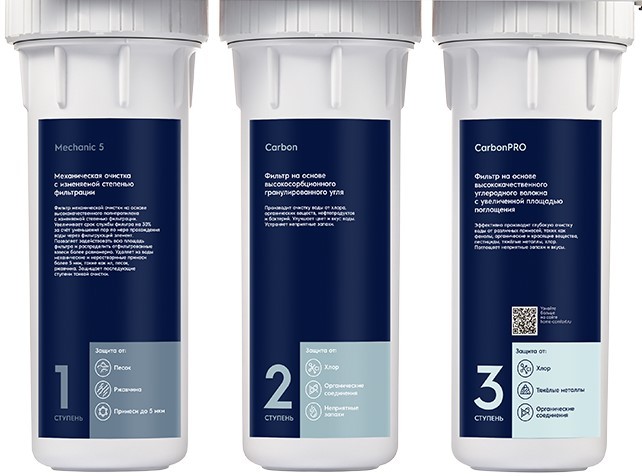 Трехступенчатая система фильтрации на основе механической и сорбционной очистки удаляет такие загрязнения, как ил, песок, ржавчина, хлор и хлорорганические соединения. Удаляет неприятные запахи и вкусы, мутность воды.