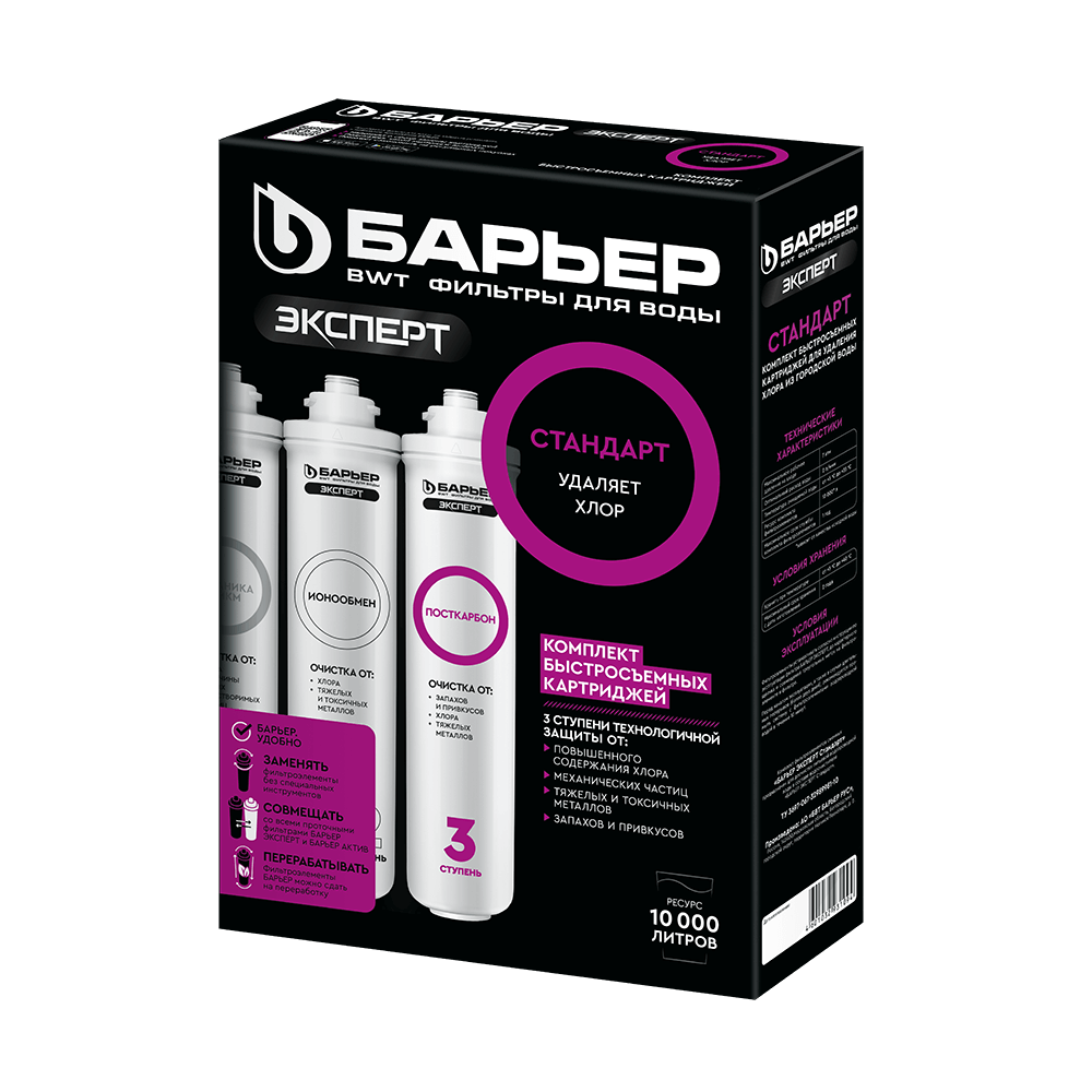 Комплект сменных картриджей Барьер Эксперт Стандарт для комплексной очистки водопроводной воды от вредных примесей. Устанавливается в проточный фильтр Эксперт Стандарт