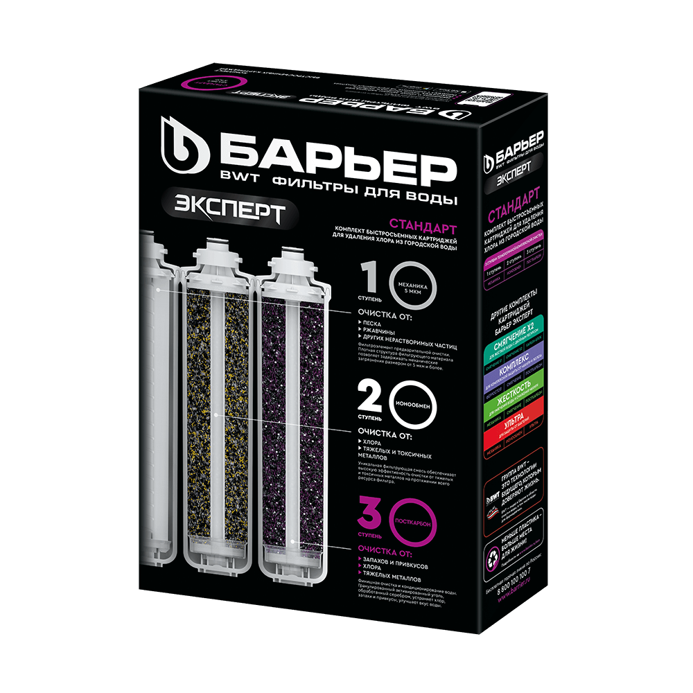 Комплект компактных сменных картриджей для фильтров. Применяется в трехступенчатых системах водоочистки «Эксперт Стандарт» для комплексной очистки водопроводной воды от основных содержащихся в ней вредных примесей. Подходит ко всем фильтрам линейки БАРЬЕР Эксперт.
