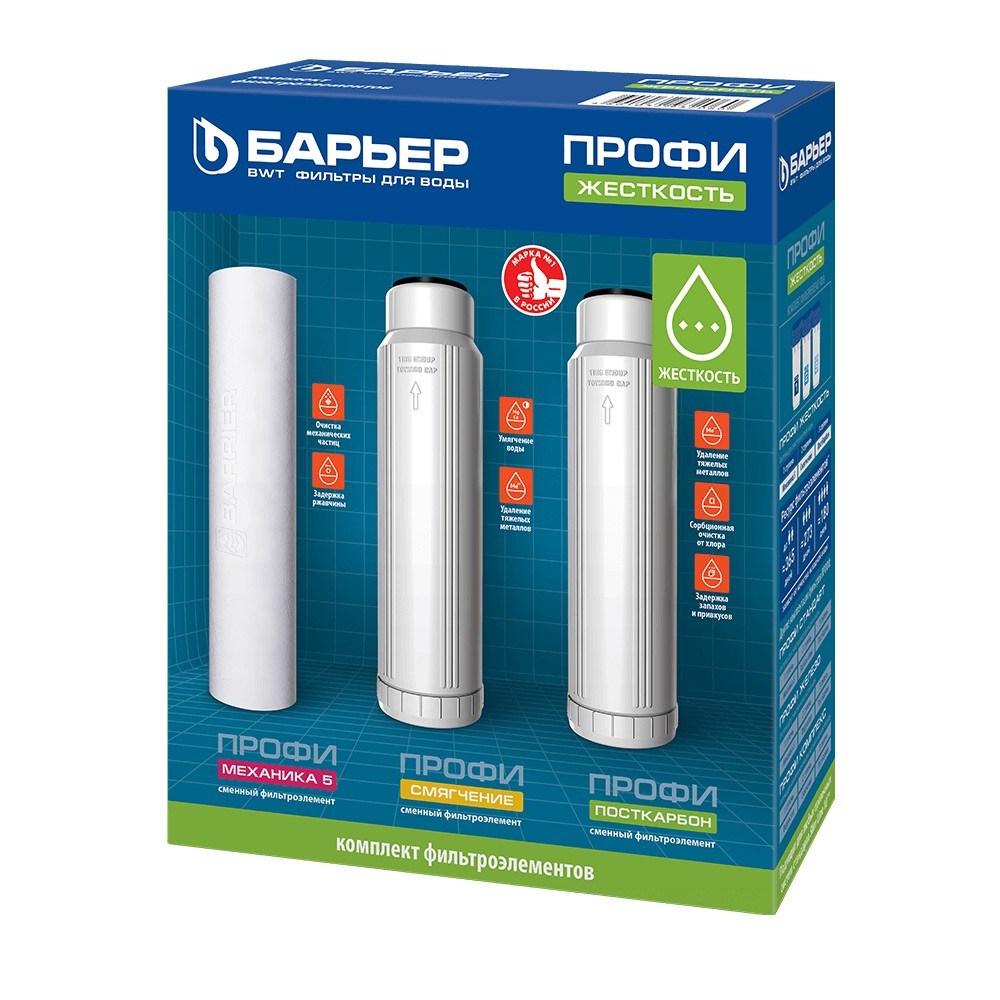 Комплект сменных картриджей Барьер ПРОФИ Hard для трехступенчатой системы водоочистки ПРОФИ Hard. Снижение жесткости (2 ступень), очистка от хлора (3 ступень), очистка от железа (3 ступень), механическая очистка (1 ступень)