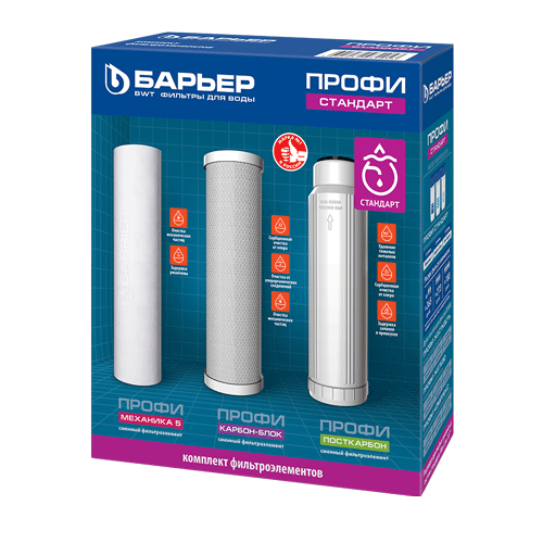 Комплект сменных картриджей Барьер ПРОФИ Standart для трехступенчатой системы водоочистки ПРОФИ Standart. Oчистка от хлора, хлорорганических соединений, фенола и других соединений органических и неорганических веществ. Дополнительная тонкая очистка от механических загрязнений.
