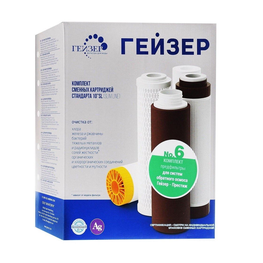 Готовое решение из коробки – комплект картриджей №6 – подготавливает водопроводную воду для более тонкой очистки на мембране обратного осмоса в фильтрах Гейзер-Престиж. Три последовательно установленных элемента удаляют всю механику, органику, хлор и прочие химические примеси.
