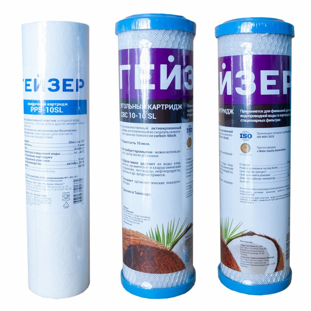 Комплект №6 от компании Гейзер, используемый линейке фильтров обратного осмоса, состоит из трех сменных картриджей стандарта 10SL. Каждый модуль выполняет свою специфическую роль в очистке и подготовки воды для дальнейшей фильтрации.