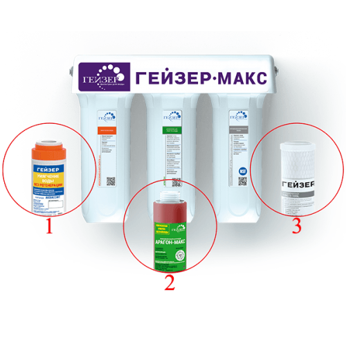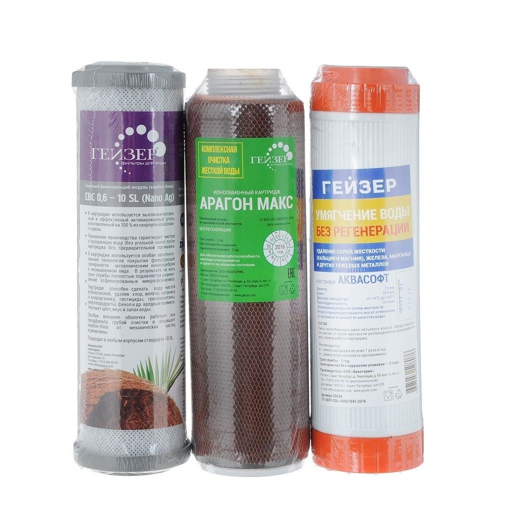 Комплект № 17 для фильтра Гейзер Макс включает в себя комплект из трех сменных картриджей: Аквасофт, Арагон Макс, СВС Ag. Предназначены для умягчения, а также очистки жесткой воды от железа, хлора, тяжелых металлов, избыточных солей и других вредных механических примесей. Восстановлению и регенерации не подлежит.