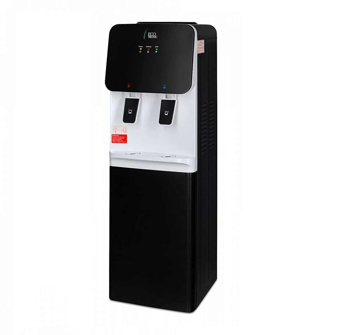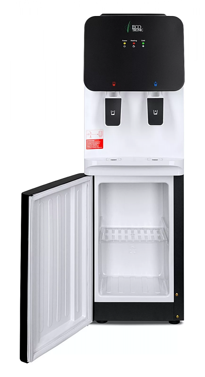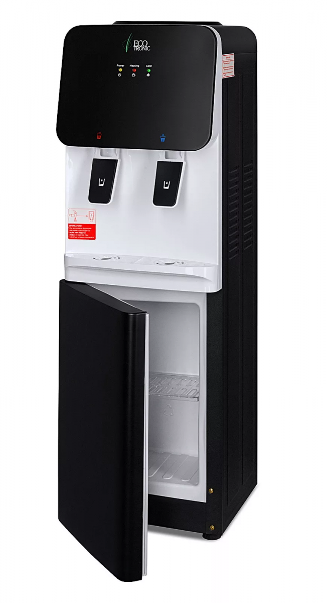 Напольный кулер без охлаждения, нагревом и шкафчиком для продуктов. Гладкая черная лицевая панель, удобные краны "нажим чашкой" и малые габариты этого аппарата эргономично впишутся в Ваш офис.