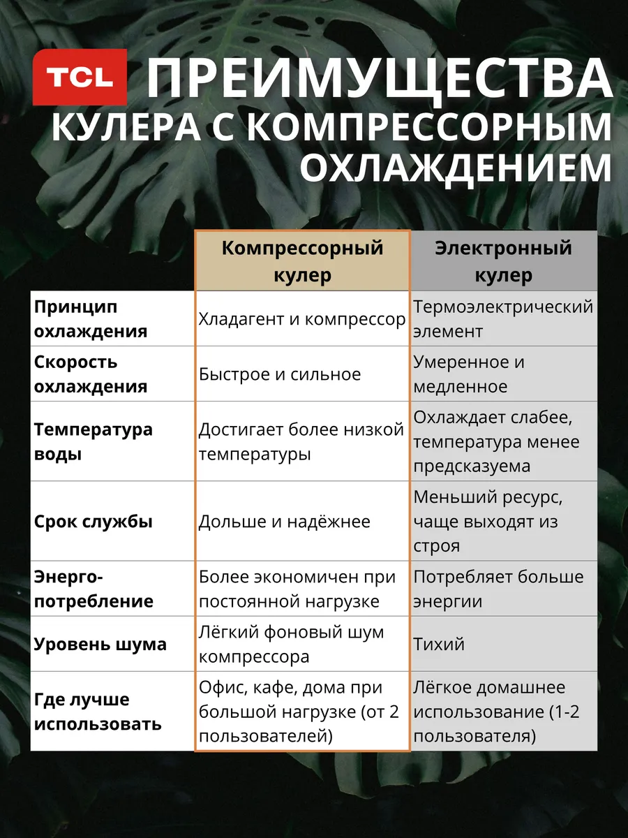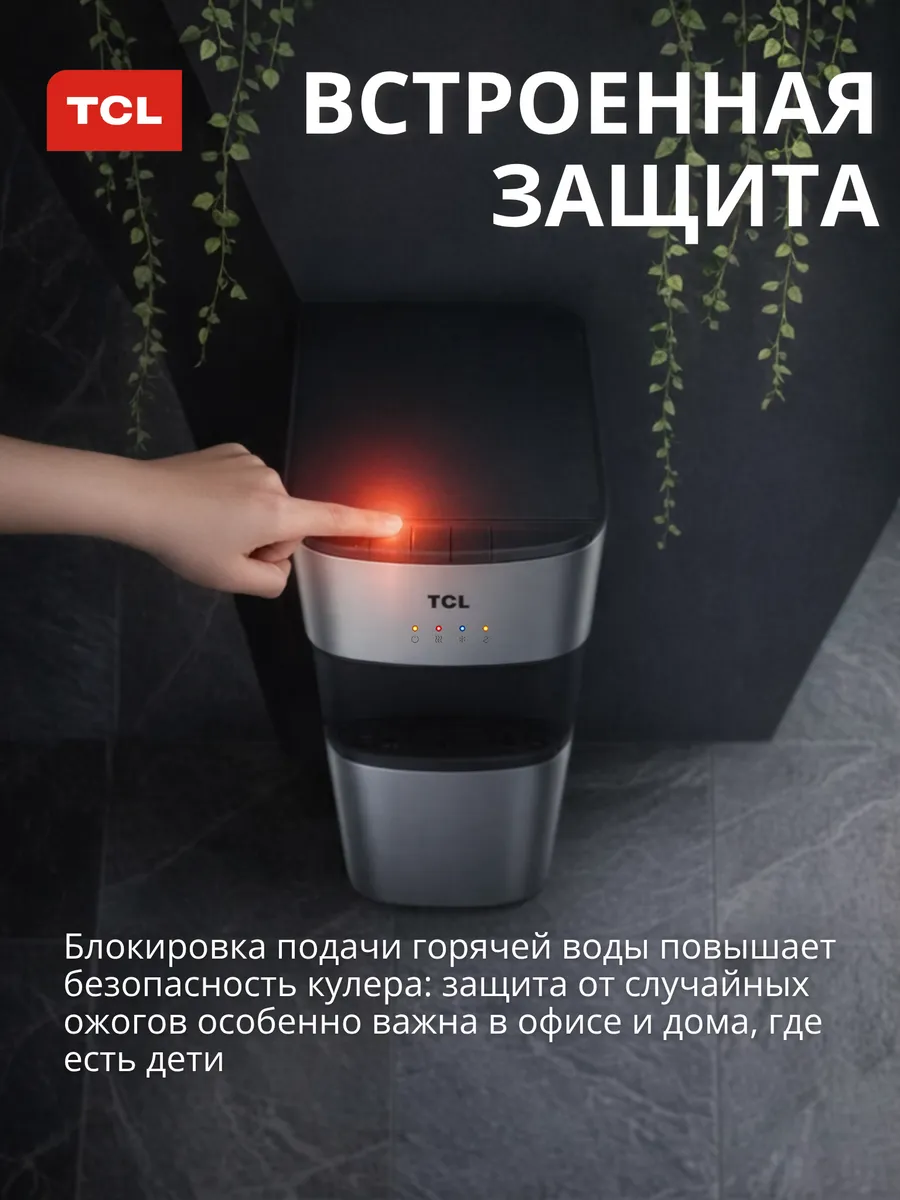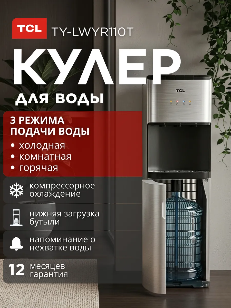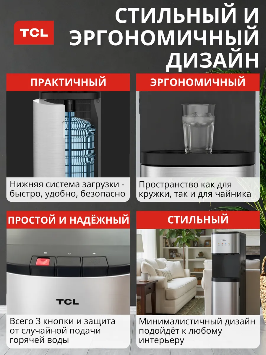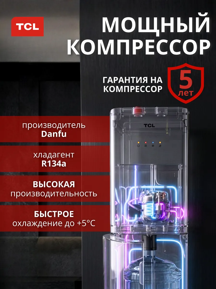 Напольный кулер для воды TCL TY-LWYR110T с нижней загрузкой бутыли и компрессорным охлаждением обеспечивает быстрый нагрев и эффективное охлаждение воды, подходит для приготовления чая, кофе и холодных напитков.