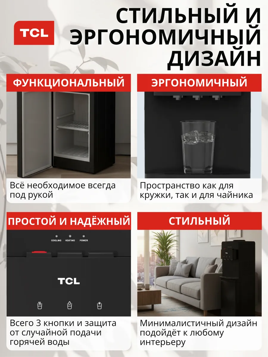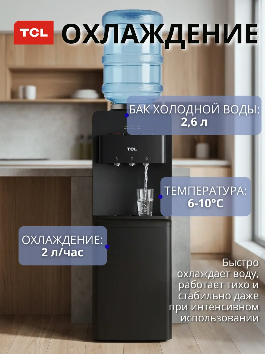 Кулер для воды напольный TCL TY-LWYR87W, нагрев/охлаждение, производительность 4 л/час (нагрев), 2 л/час (охлаждение), мощность нагрева 420 Вт, мощность охлаждения 100 Вт