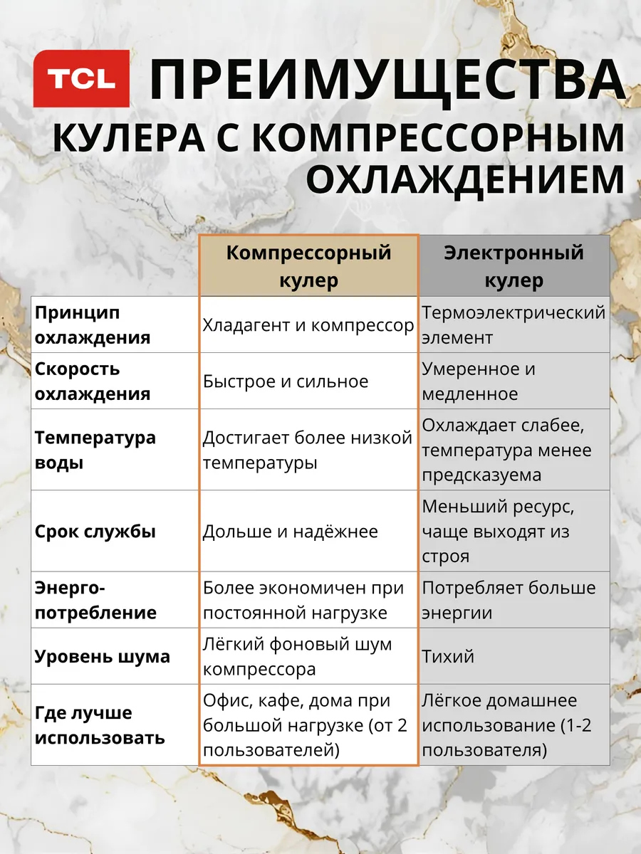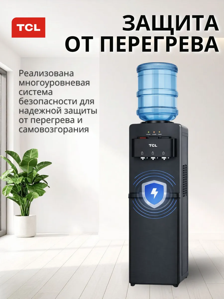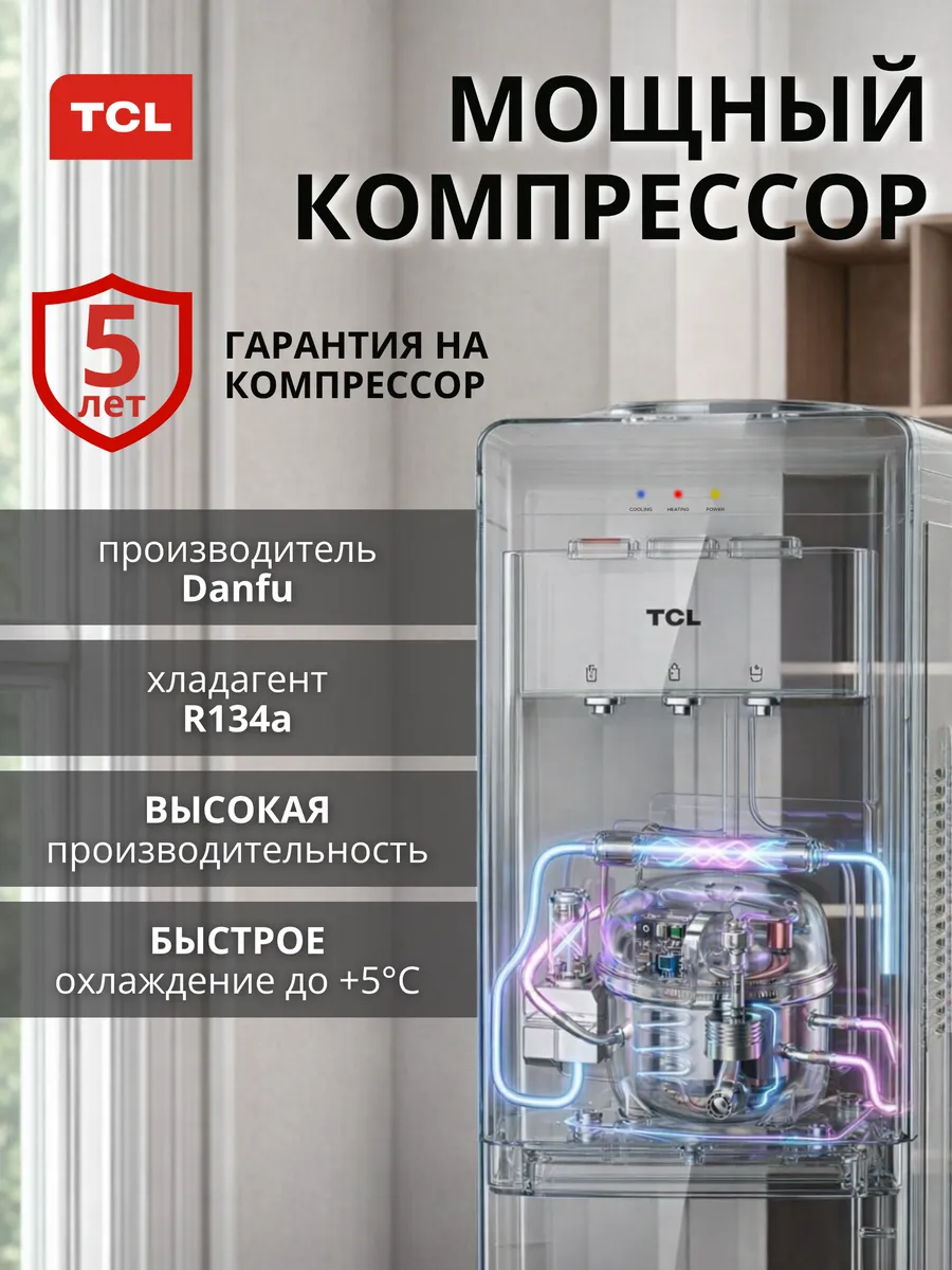 Напольный кулер для воды TCL TY-LWYR87W с верхней загрузкой бутыли и компрессорным охлаждением обеспечивает быстрый нагрев и эффективное охлаждение воды, подходит для приготовления чая, кофе и холодных напитков.