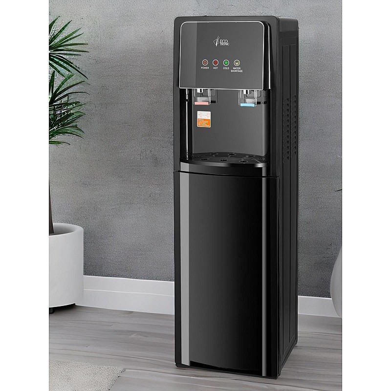Простой и современный напольный кулер с нижней загрузкой бутыли и электронной системой охлаждения. Краны "нажим кружкой". Корпус черного цвета с черной стеклянной вставкой на передней панели с индикаторами. Верхняя крышка с защитой от царапин. Индикация режимов нагрева и охлаждения воды, индикатор пустой бутыли.