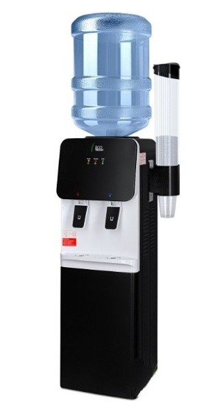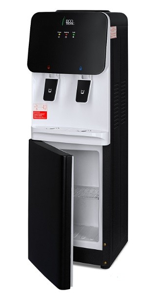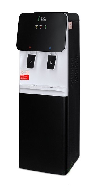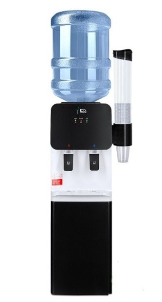 Компактный кулер для воды с функциями нагрева и охлаждения. С небольшим шкафчиком в нижней части. Электронное охлаждение. Корпус черного цвета с белой вставкой в области кранов подачи воды. Индикация режимов нагрева, охлаждения и готовности воды. Краны «нажим кружкой».