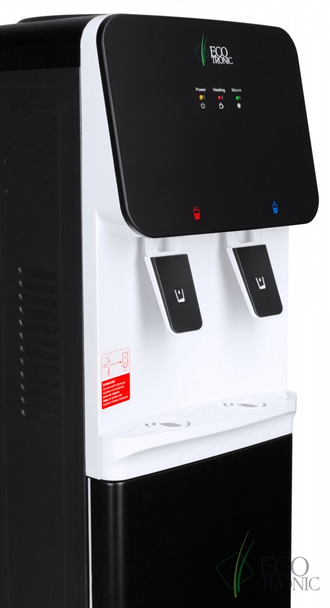 Компактный кулер для воды без охлаждения, только нагрев. С небольшим шкафчиком в нижней части. Корпус черного цвета с белой вставкой в области кранов подачи воды. Индикация режимов работы, нагрева и готовности воды. Краны "нажим кружкой". Передняя панель сверху имеет широкое ровное пространство, подходящее для брендирования и нанесения логотипа.