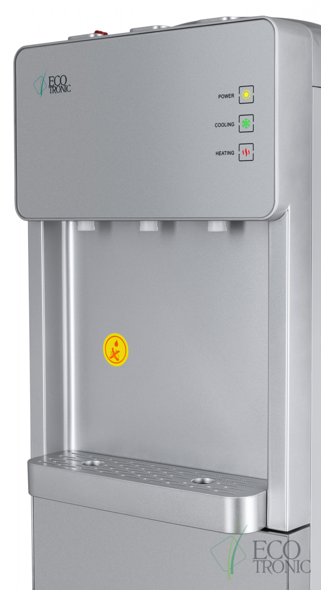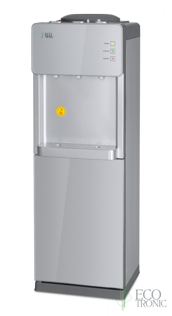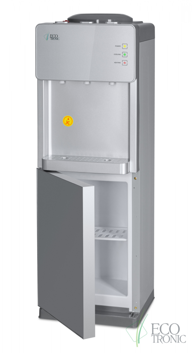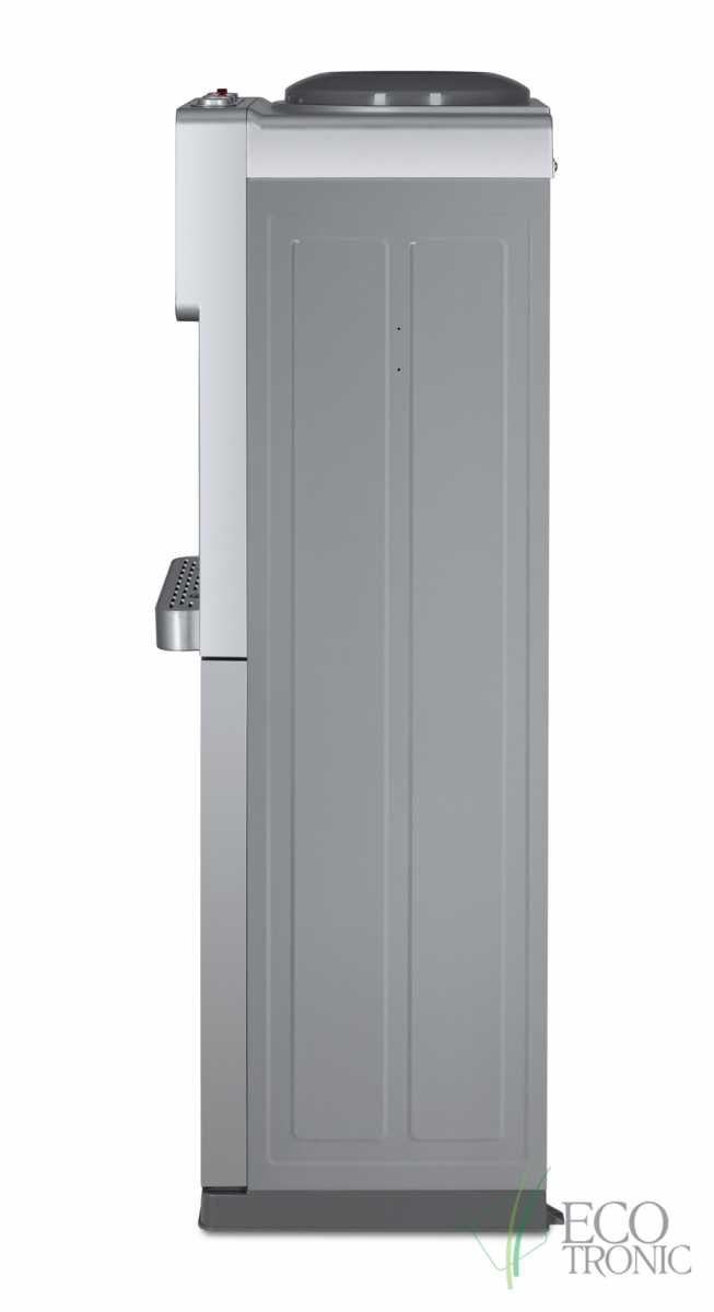 Напольный кулер с электронным охлаждением и шкафчиком в нижней части. Три крана подачи воды (клавиши): для подачи горячей воды, холодной и комнатной температуры (из бутыли). Защита на кране горячей воды. Корпус серебристого цвета с эффектной стеклянной передней панелью. В верхней части расположены светодиодные индикаторы работы, нагрева и охлаждения.