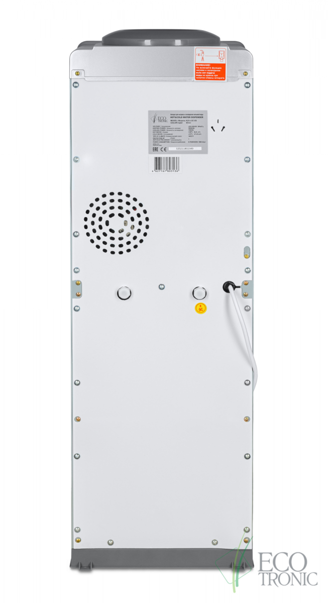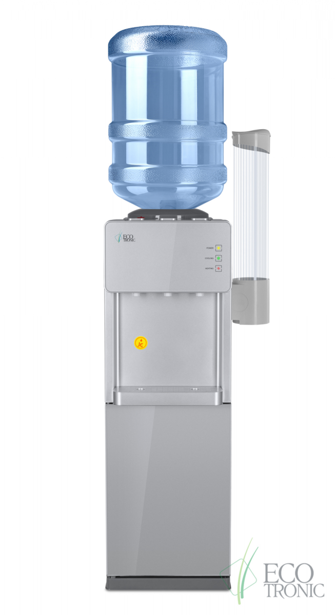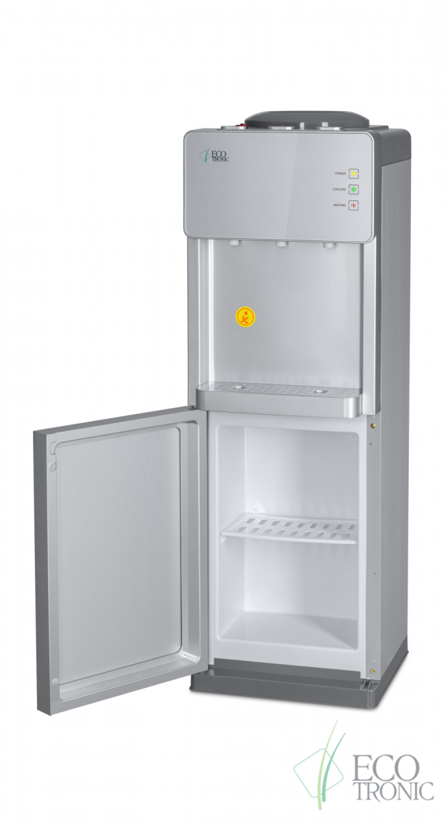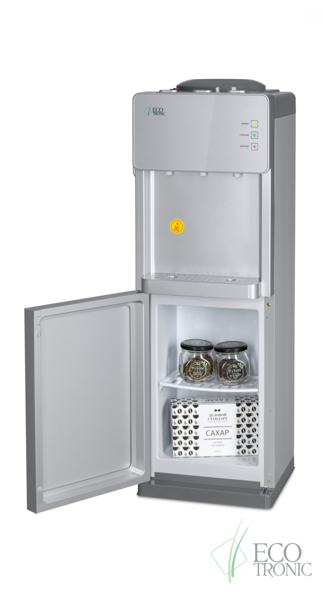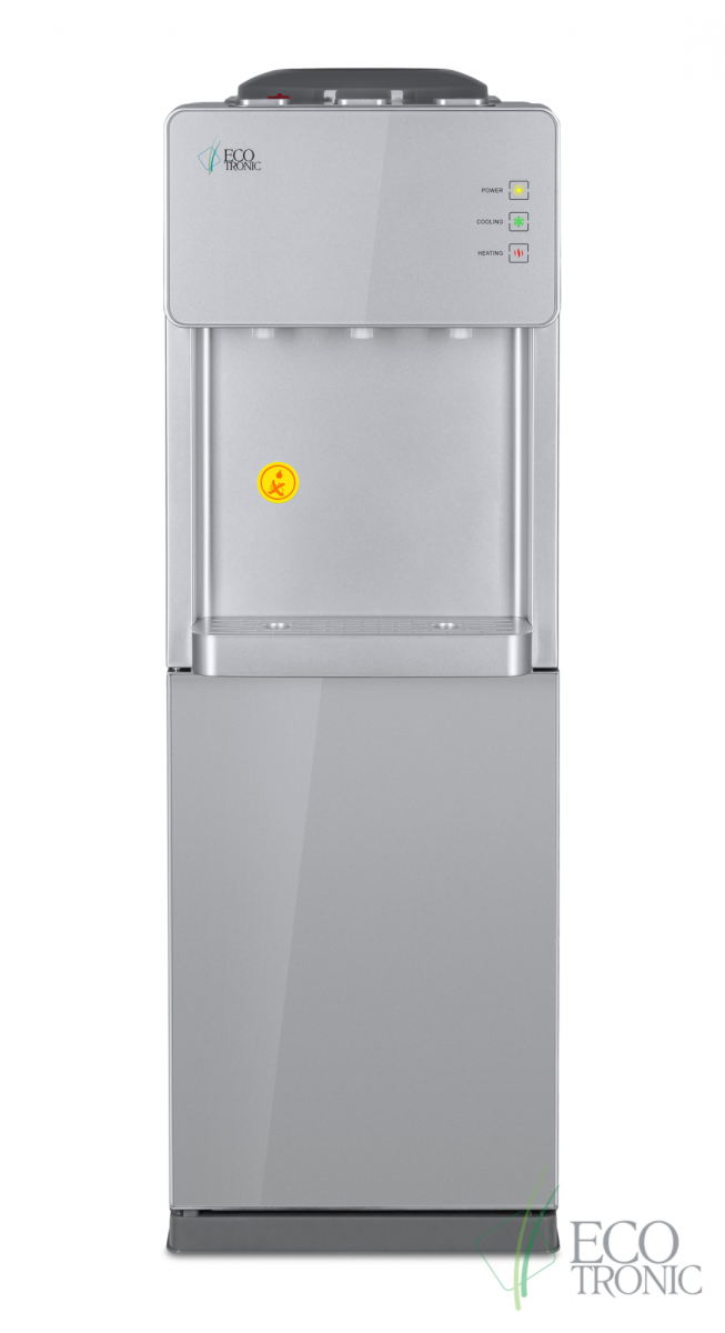 Напольный кулер с электронным охлаждением и шкафчиком в нижней части. Три крана подачи воды (клавиши): для подачи горячей воды, холодной и комнатной температуры (из бутыли). Защита на кране горячей воды. Корпус серебристого цвета с эффектной стеклянной передней панелью. В верхней части расположены светодиодные индикаторы работы, нагрева и охлаждения.