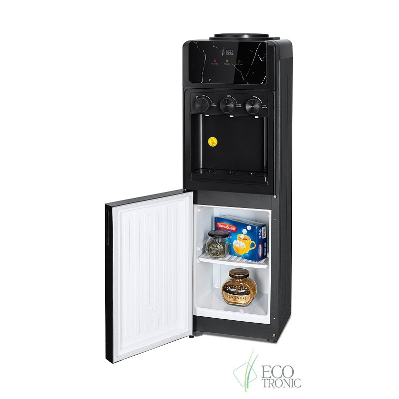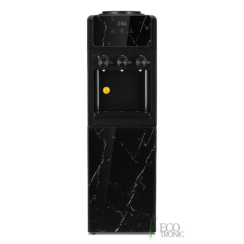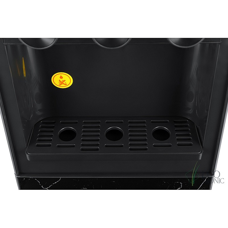 Напольный кулер с электронным охлаждением и функциональным шкафчиком для хранения в нижней части. Электронное охлаждение. Поворотные краны подачи воды, три крана: для горячей воды, холодной и воды комнатной температуры. Корпус чёрного цвета с черной стеклянной вставкой под мрамор. В верхней части расположены индикаторы подключения к сети, нагрева и охлаждения.