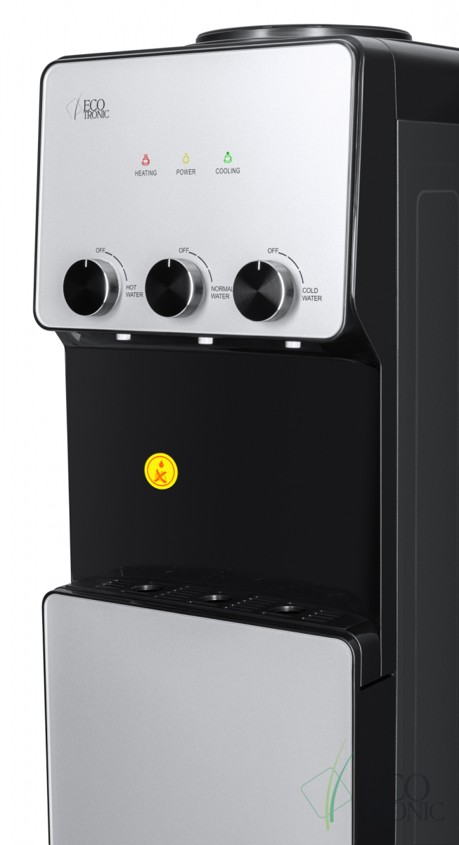 Напольный кулер с электронным охлаждением и вместительным шкафчиком в нижней части. Три крана поворотного типа: для подачи горячей воды, холодной и комнатной температуры. Для подачи воды нужно повернуть соответствующий кран, для остановки подачи — вернуть его в исходное положение. Корпус полностью чёрного цвета, верхняя панель с индикаторами и нижняя передняя панель (дверца шкафчика) со вставками из стекла серебристого цвета.