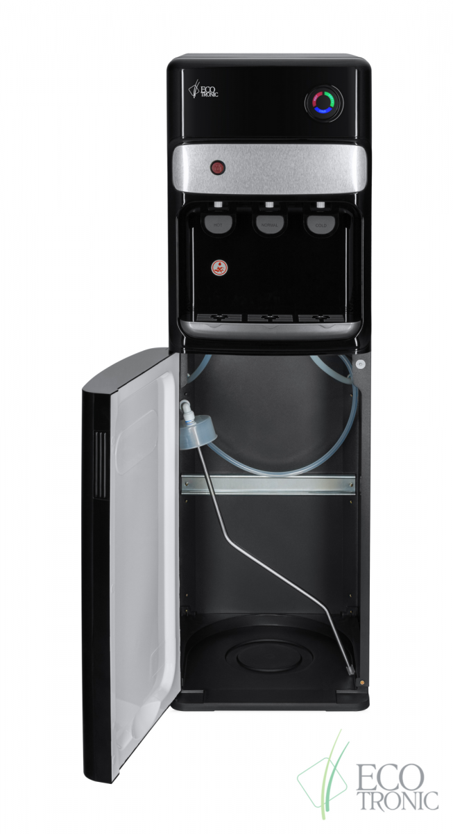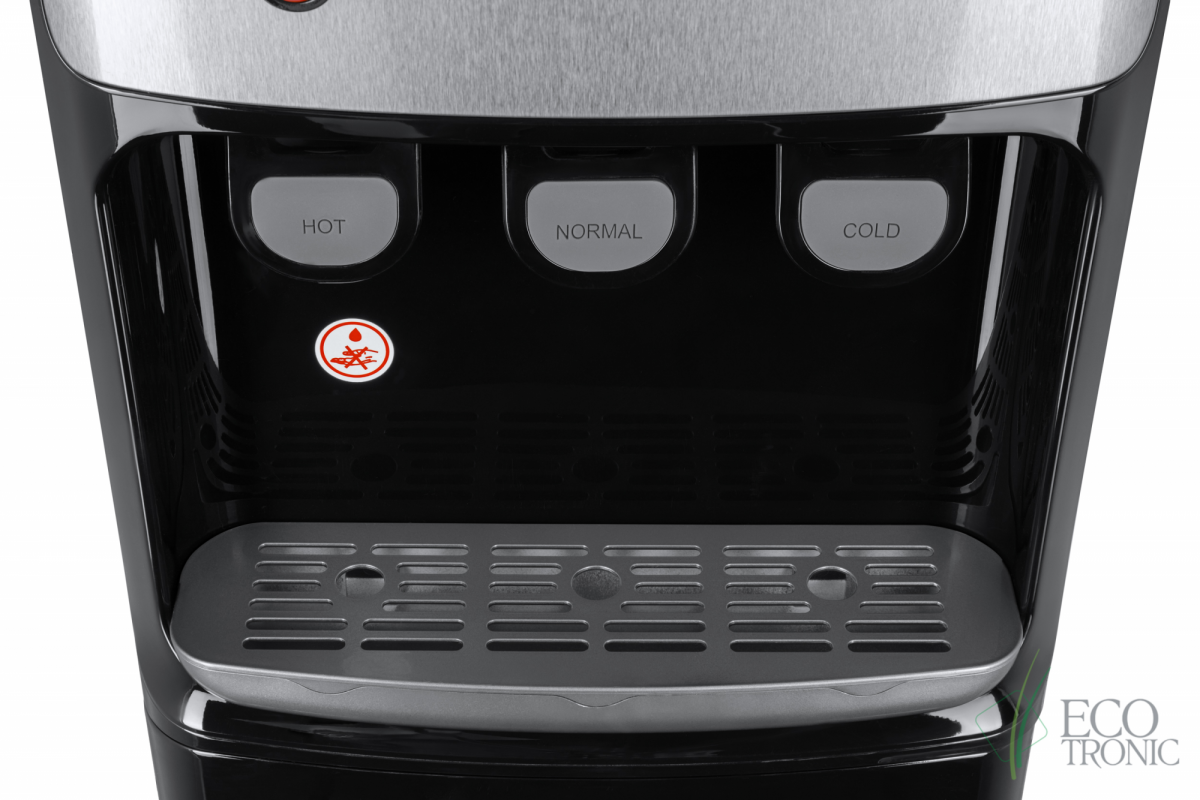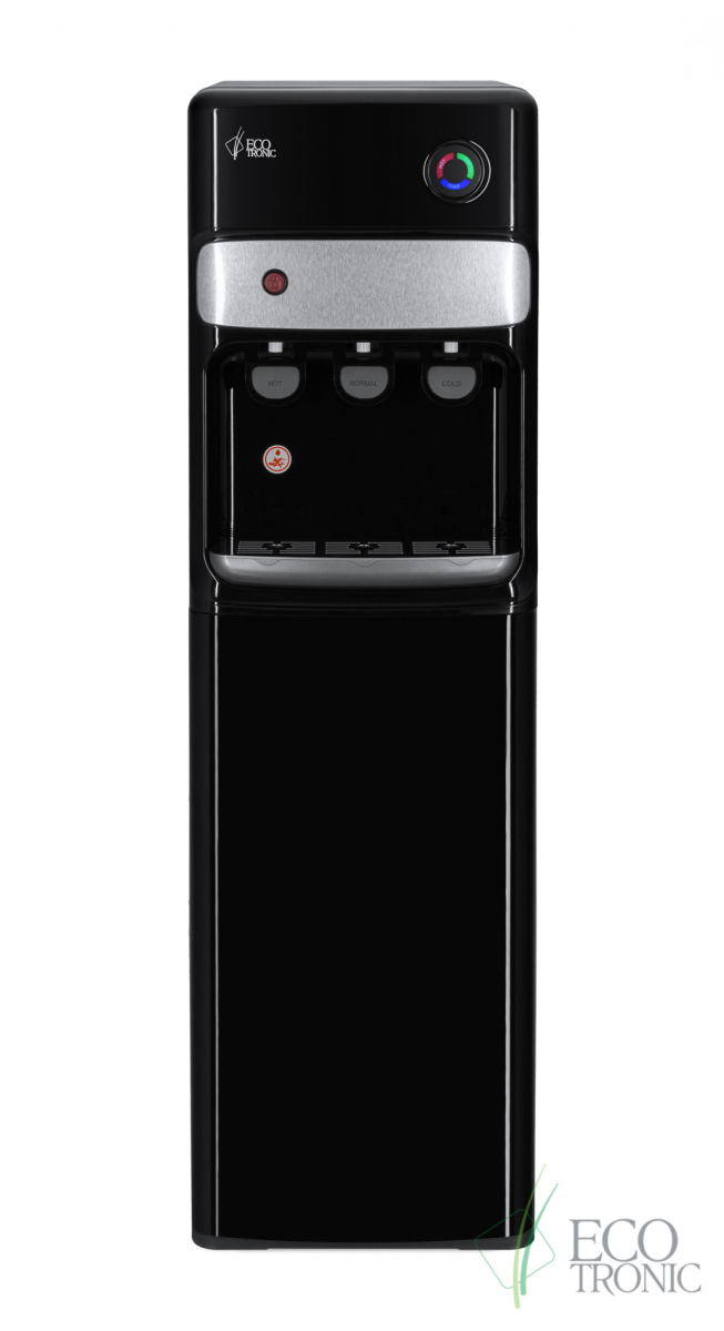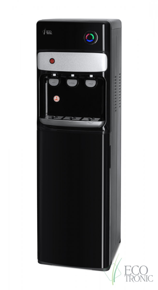 Напольный кулер с нижней загрузкой и электронным охлаждением. Три крана подачи воды типа "нажим кружкой": для подачи горячей воды, холодной и комнатной температуры (из бутыли). Защита на кране горячей воды. Корпус черного цвета с вставкой из нержавеющей стали на передней панели. Светодиодные индикаторы работы, нагрева и охлаждения сгруппированы в один блок круглой формы в верхней части передней панели.