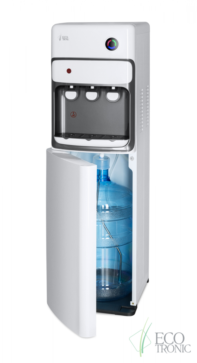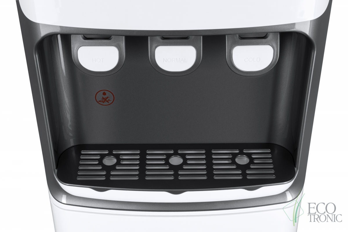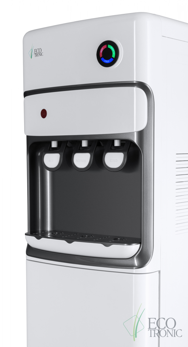 Напольный кулер с нижней загрузкой и электронным охлаждением. Три крана подачи воды типа "нажим кружкой": для подачи горячей воды, холодной и комнатной температуры (из бутыли). Защита на кране горячей воды. Корпус белого цвета с серой вставкой в области кранов подачи воды на передней панели. Светодиодные индикаторы работы, нагрева и охлаждения сгруппированы в один блок круглой формы в верхней части передней панели.