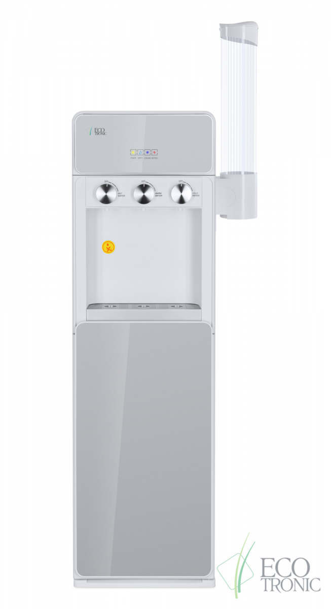 Модель с электронным охлаждением, со стандартной производительностью. Есть индикация работы аппарата, нагрева, охлаждения и необходимости заменить бутыль. Бак горячей воды с бандажным (внешним) нагревателем для работы с более жесткой водой и долговечности.