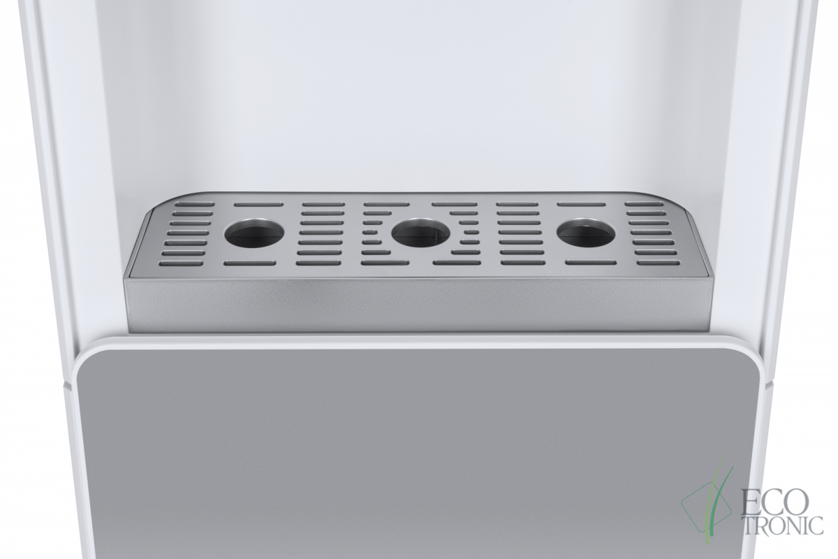 Стильные алюминиевые поворотные краны, корпус белого цвета с серебристыми вставками на передней панели, серебристый лоток водоприема и нижний отсек, в котором полностью скрывается бутыль, позволяют эффектно вписать этот кулер в современный интерьер с продуманным дизайном.