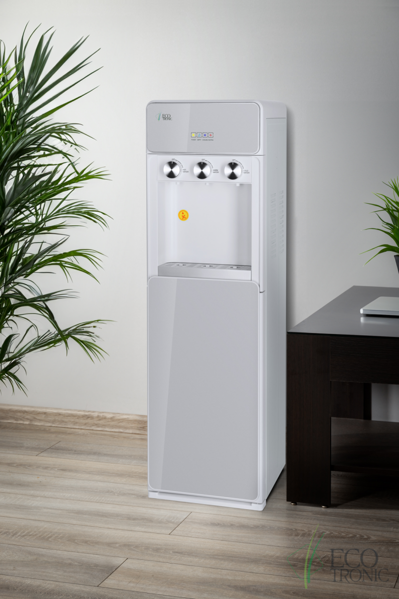 Напольный кулер с нижней загрузкой бутыли, поворотными кранами подачи воды и электронным охлаждением.