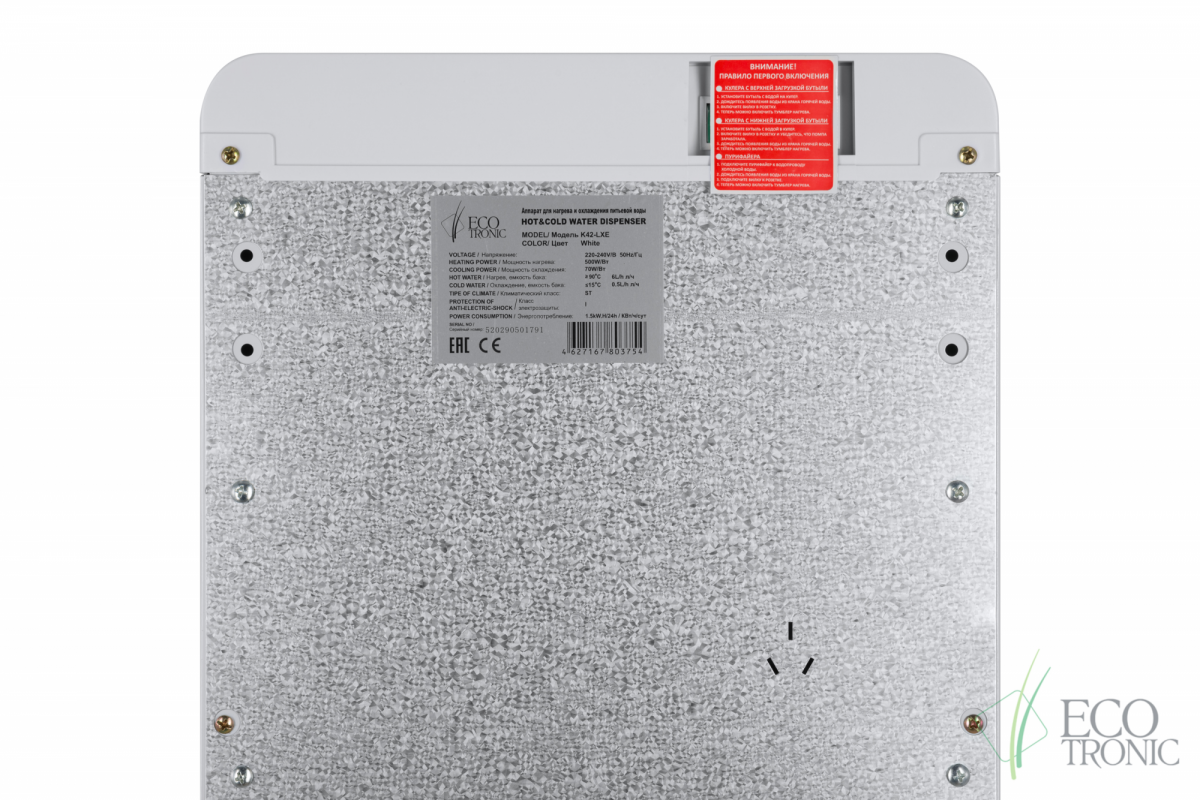 Кулер Ecotronic K42-LXE white, нагрев и охлаждение, производительность нагрева 5 л/ч, производительность охлаждения 1 л/ч, мощность нагрева 430 Вт, мощность охлаждения 60 Вт, размещение напольное