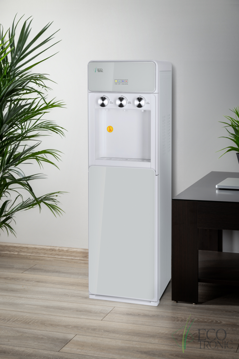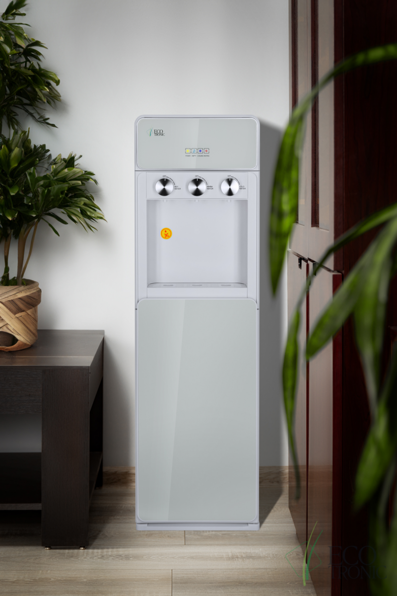 Напольный кулер с нижней загрузкой бутыли, поворотными кранами подачи воды и электронным охлаждением.