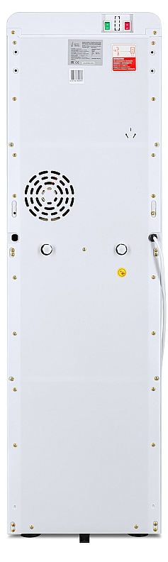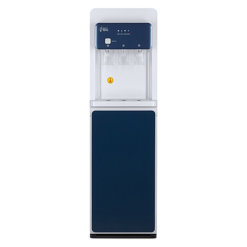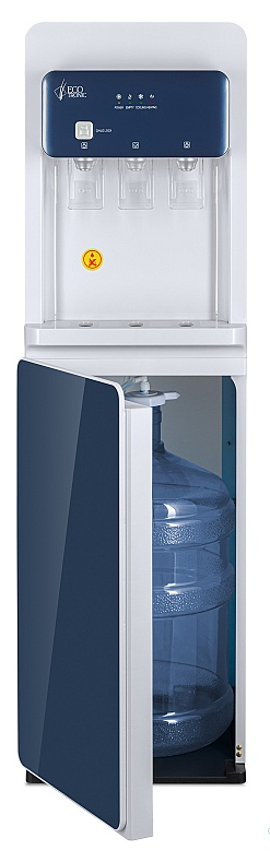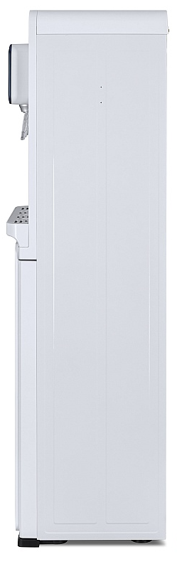 Напольный кулер с нижней загрузкой бутыли и стильным корпусом со стеклянной вставкой на нижней панели. Эффектный дизайн. Бутыль с водой в нижнем отсеке, дверца которого имеет глянцевую стеклянную поверхность. Корпус белого цвета с синими вставками на передней панели. Модель с электронным охлаждением, со стандартной производительностью. Есть индикация работы аппарата, нагрева, охлаждения и необходимости заменить бутыль. Три крана подачи воды: горячей, холодной и комнатной температуры. Краны типа "нажим кружкой". Защита от случайного нажатия на кране горячей воды.