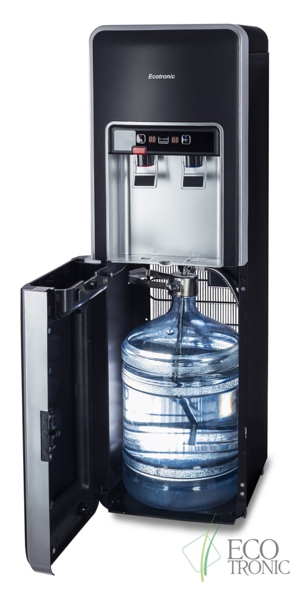 Ecotronic P5-LXPM black - кулер с нижней загрузкой бутыли. Температурный монитор с управлением. Краны нажим кружкой. Горячий кран с защитой от случайного нажатия (защита от детей).