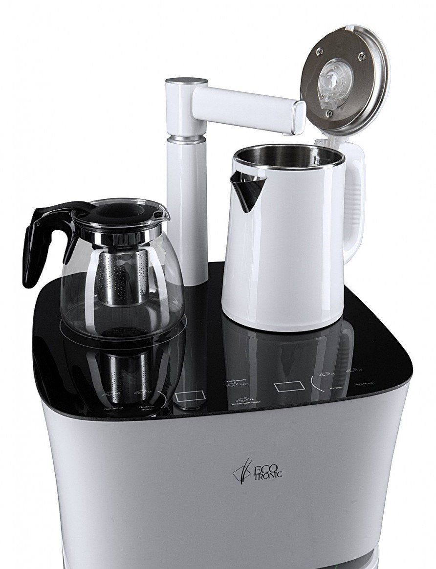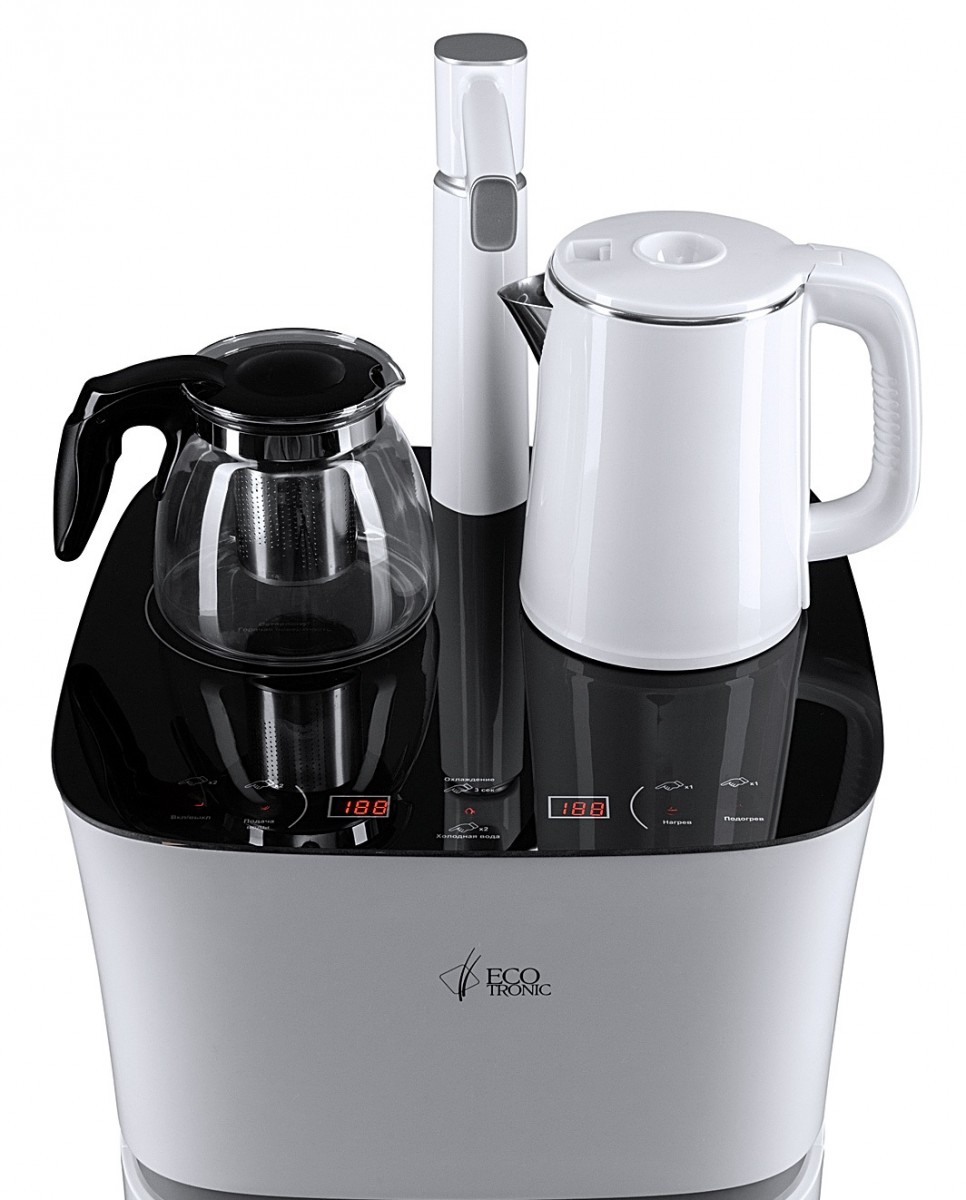 Тиабар Ecotronic TB11-LE white – это напольный кулер с чайным столиком. Нижняя загрузка бутыли, электронное охлаждение. Нагрев воды в чайнике до 100°С. Два чайника – для кипячения (изотермический) и заварочный. Стильный и многофункциональный тиабар: