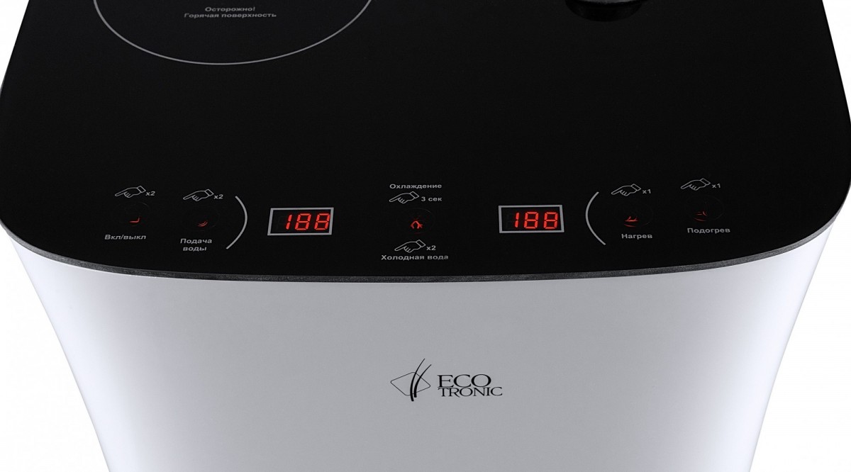 Панель управления сенсорная, на русском языке, с информационным дисплеем. Корпус и передняя панель белого цвета. Поверхность чайного столика черная, чайник для кипячения и кран подачи воды белого цвета с серебристой отделкой.