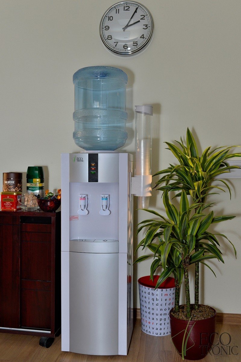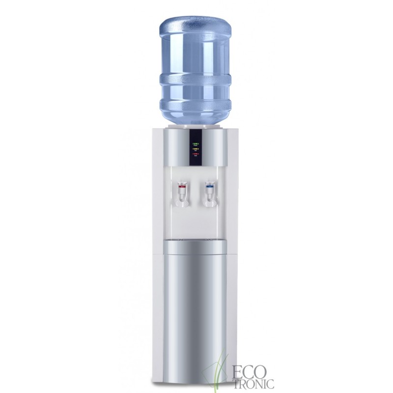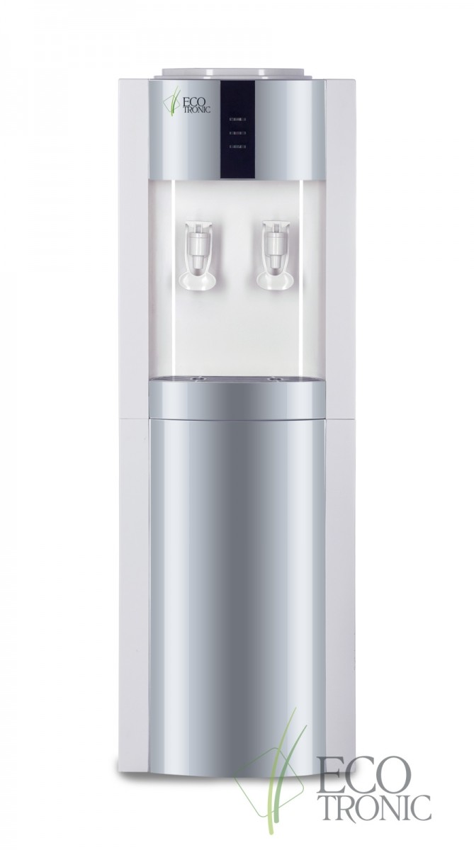 Ecotronic V21-L white+silver. Напольный кулер белого цвета с серебристой вставкой. Компрессорное охлаждение. Тип кранов подачи воды - "Нажим кружкой".