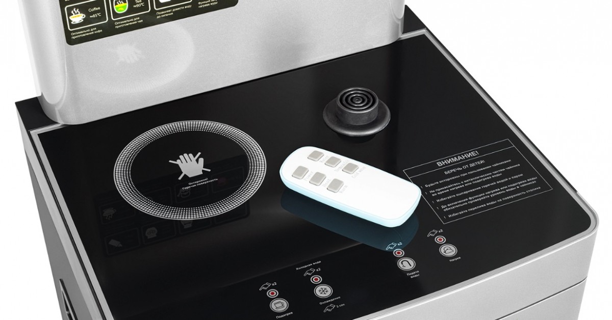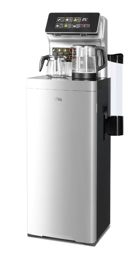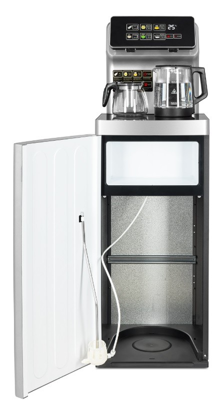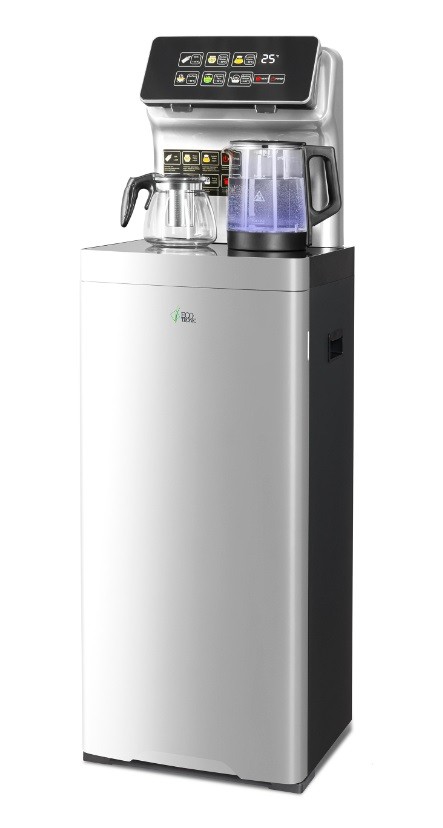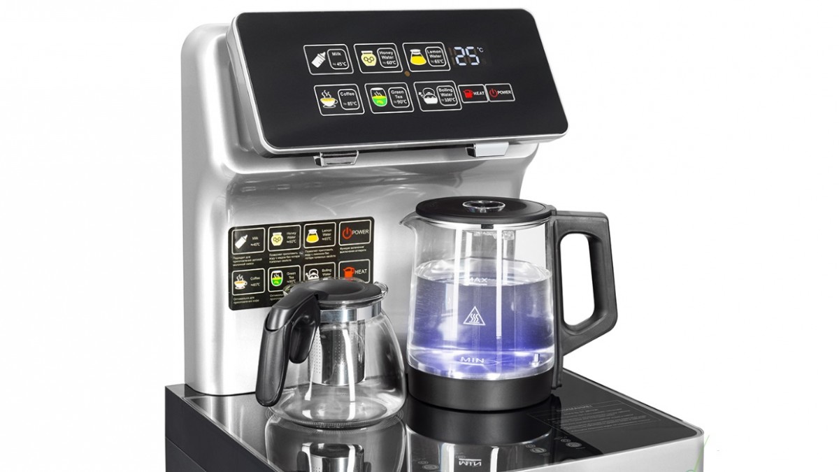Тиабар Ecotronic TB15-LER silver — это напольный кулер с чайным столиком. Большая и удобная панель управления с возможностью задать температуру нагрева (6 режимов нагрева). Пульт дистанционного управления. Нижняя загрузка бутыли. Два чайника — для кипячения и заварочный. Электронное охлаждение. Нагрев воды в чайнике до 100°С. Шкафчик для хранения.