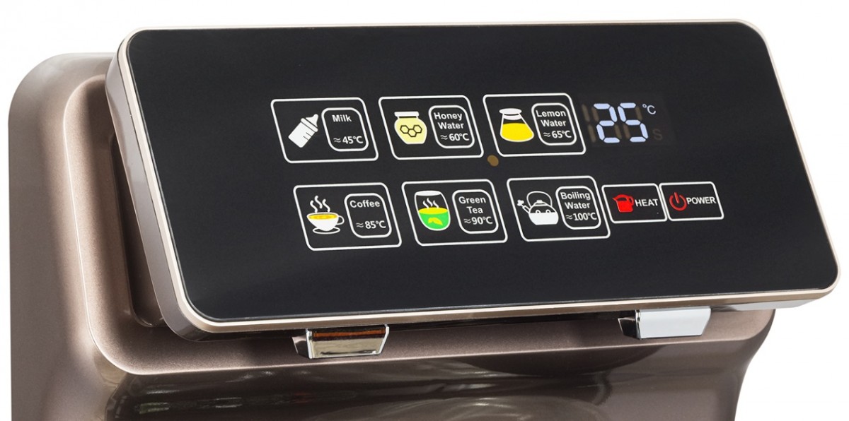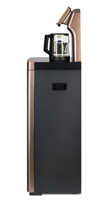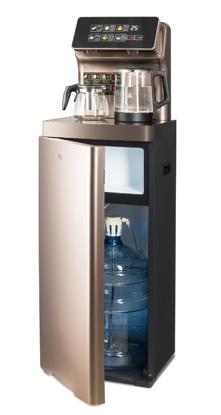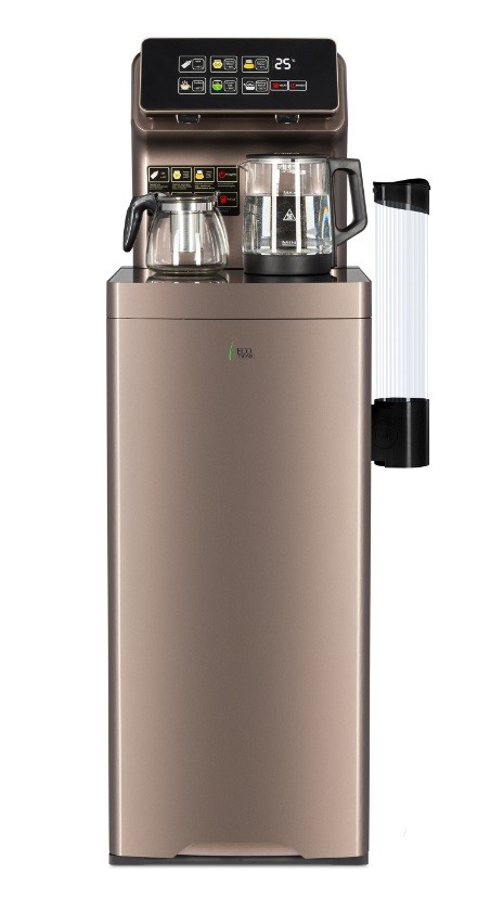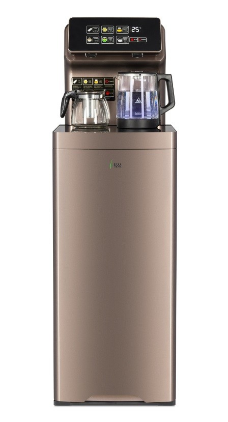 Тиабар Ecotronic TB15-LNR gold — это напольный кулер с чайным столиком. Большая и удобная панель управления с возможностью задать температуру нагрева (6 режимов нагрева). Пульт дистанционного управления. Нижняя загрузка бутыли. Два чайника — для кипячения и заварочный. Без охлаждения, только нагрев. Нагрев воды в чайнике до 100°С. Шкафчик для хранения.