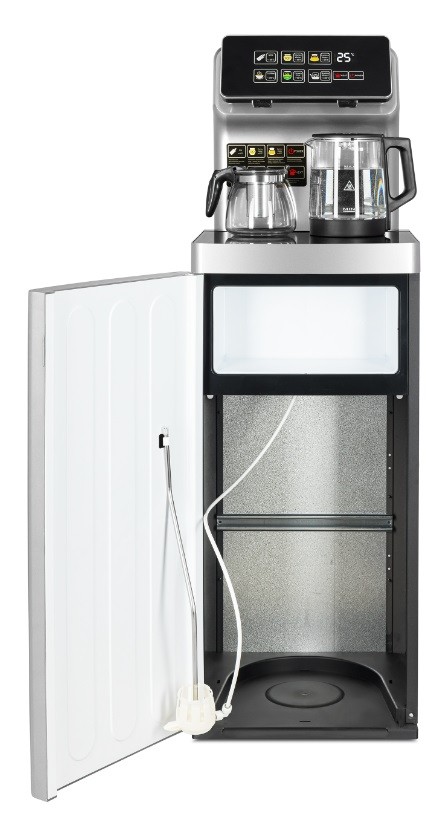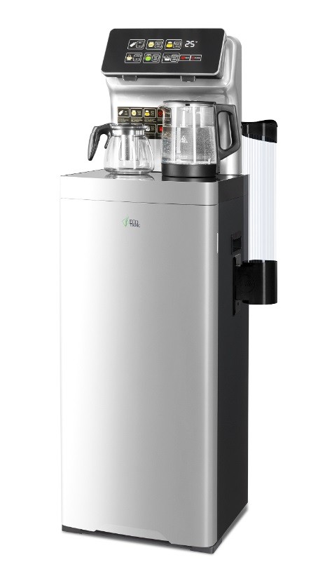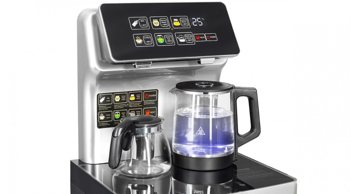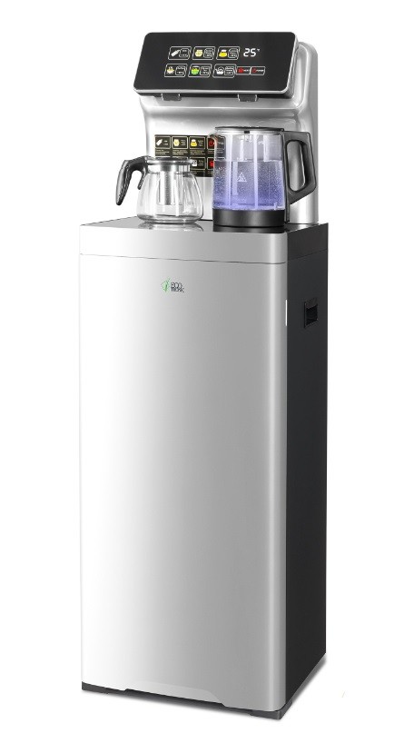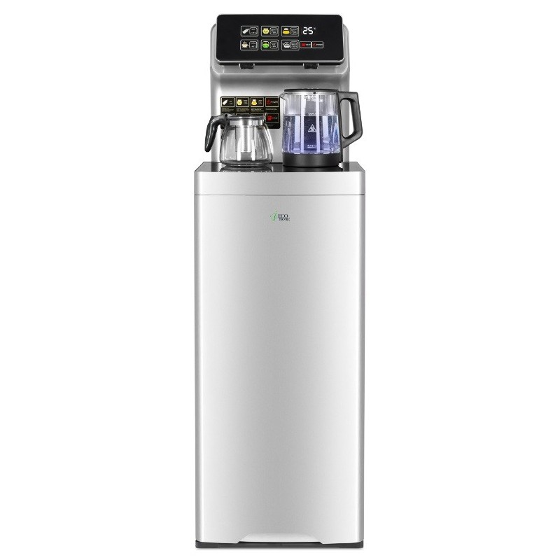 Тиабар Ecotronic TB15-LNR silver — это напольный кулер с чайным столиком. Большая и удобная панель управления с возможностью задать температуру нагрева (6 режимов нагрева). Пульт дистанционного управления. Нижняя загрузка бутыли. Два чайника — для кипячения и заварочный. Без охлаждения, только нагрев. Нагрев воды в чайнике до 100°С. Шкафчик для хранения.