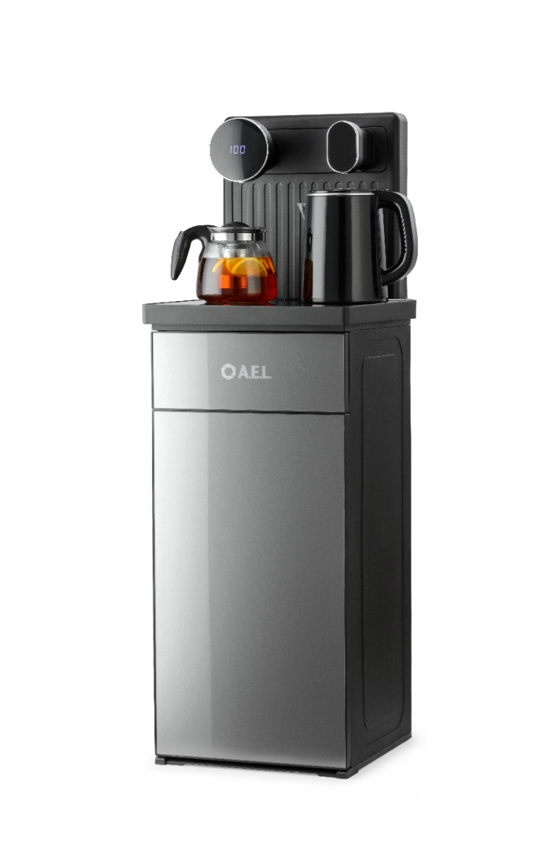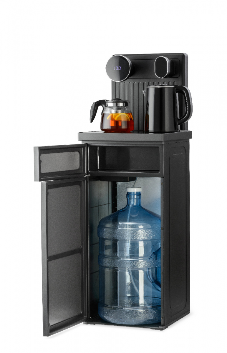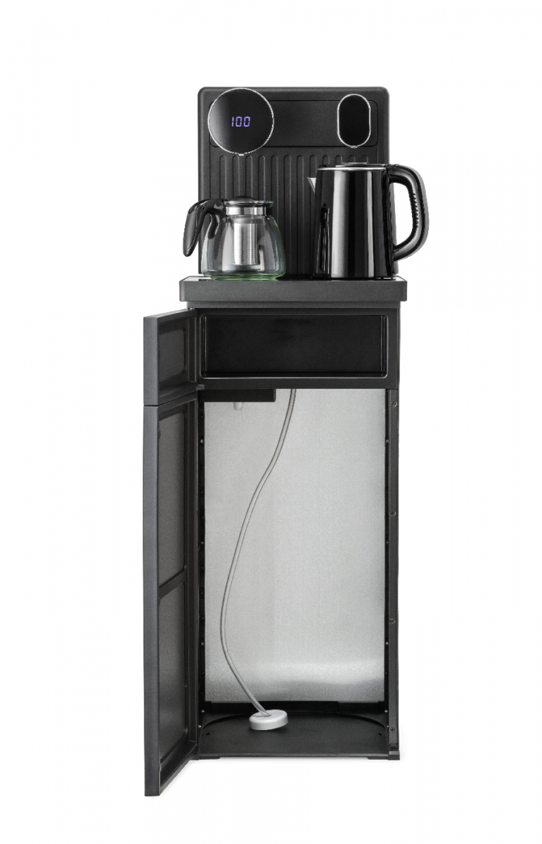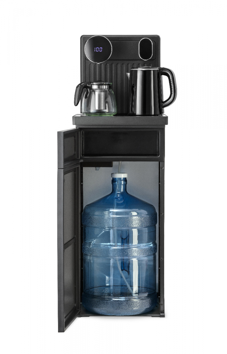 Оригинальное исполнение кулера с нижней загрузкой бутыли и с электронным охлаждением, состоит из заварочного и электрического чайников, сенсорной панели управления и шкафчика для хранения. Яркая световая индикация и информативный дисплей на сенсорной панели сообщат о текущем режиме и подключении к сети. Цвет серый. Объем чайников 1 литр. Размер в собранном виде 330x325x 995мм.