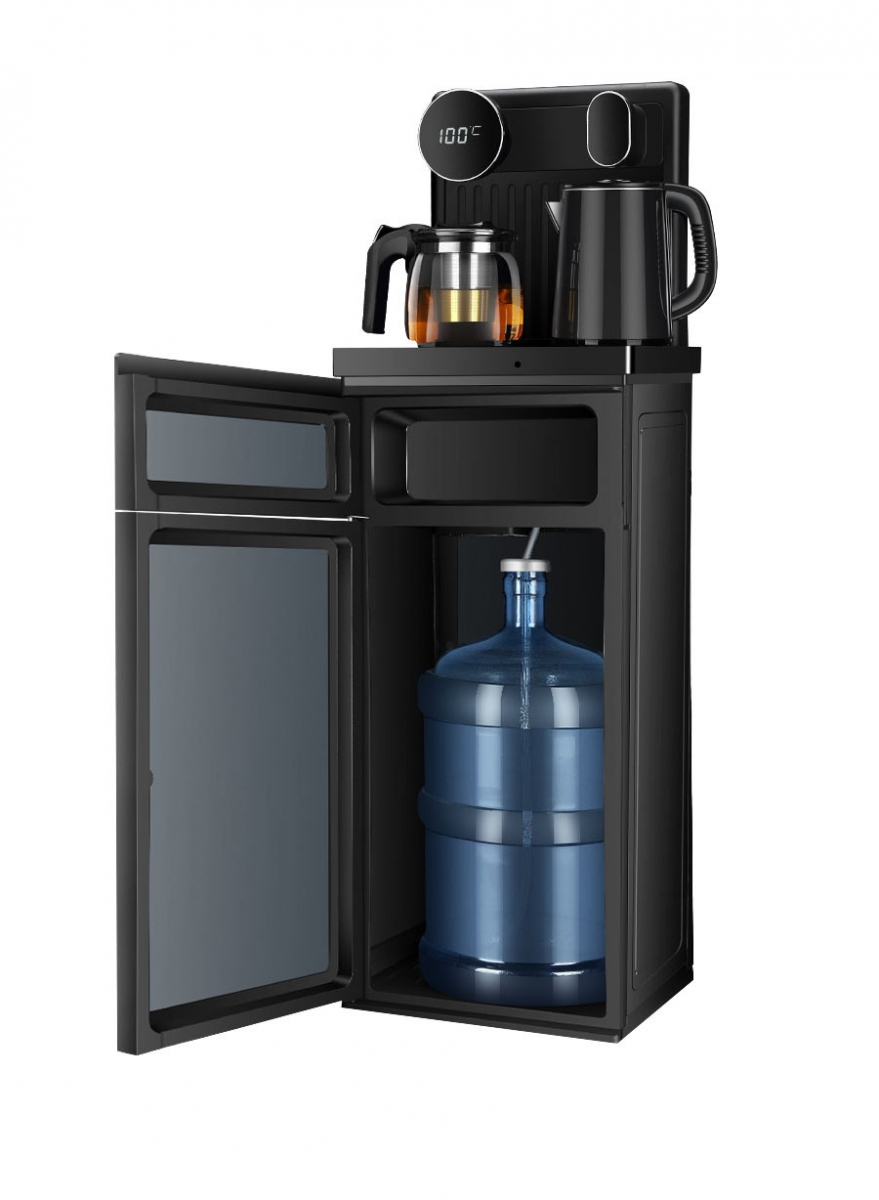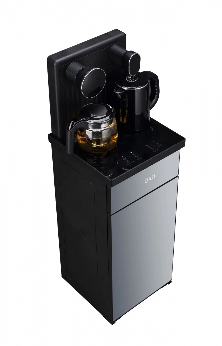 Оригинальное исполнение кулера с нижней загрузкой бутыли и без охлаждения, состоит из заварочного и электрического чайников, сенсорной панели управления и шкафчика для хранения. Яркая световая индикация и информативный дисплей на сенсорной панели сообщат о текущем режиме и подключении к сети. Цвет серый. Объем чайников 1 литр. Размер в собранном виде 330x325x 995мм.