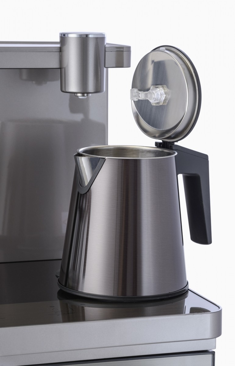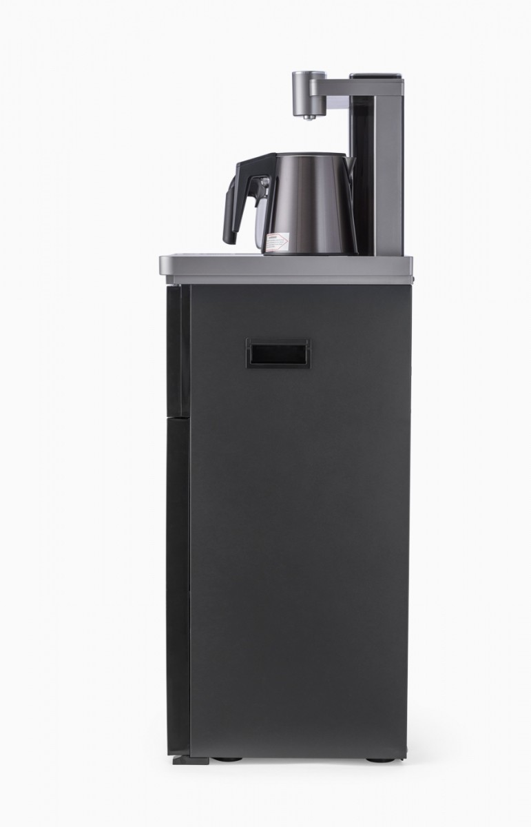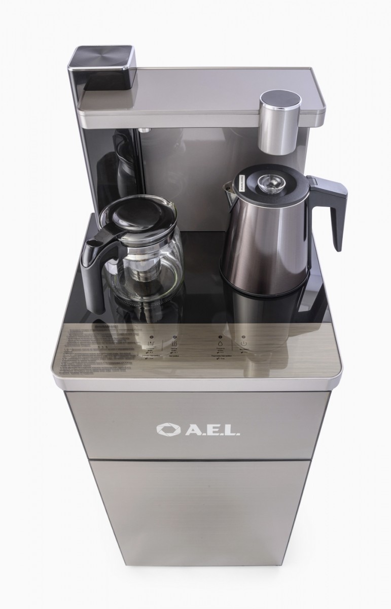 Оригинальное исполнение кулера с нижней загрузкой бутыли состоит из заварочного и электрического чайников, сенсорной панели управления, удобного крана подачи воды и шкафчика для хранения. Яркая световая индикация и информативный дисплей на сенсорной панели сообщат о текущем режиме и подключении к сети. Встроена защитная система от случайного нажатия и система подогрева заварного чайника, которая позволяет поддерживать температуру до 24 часов.