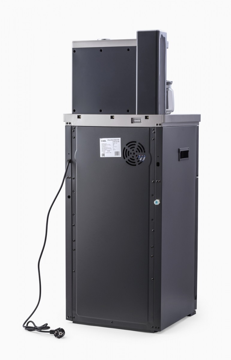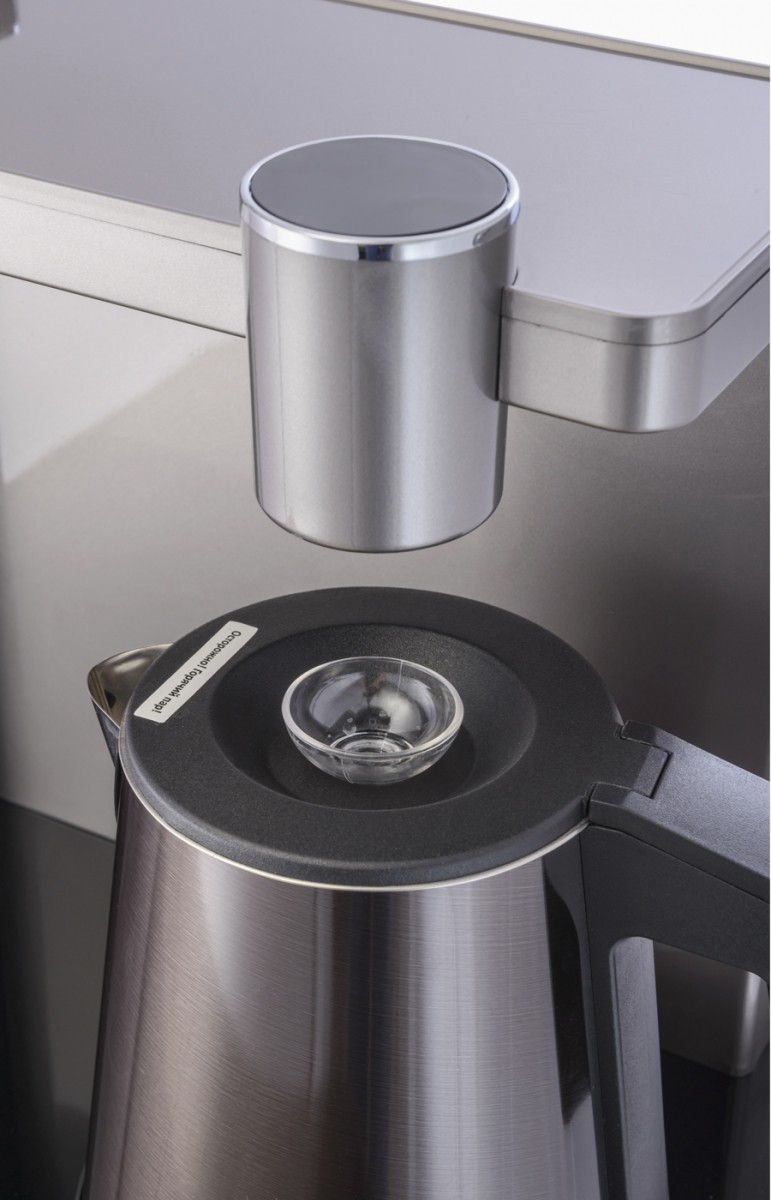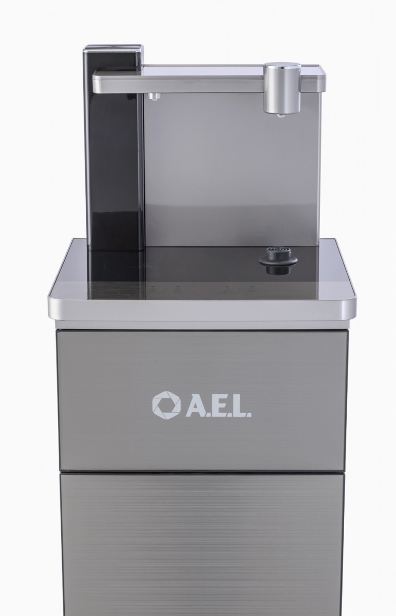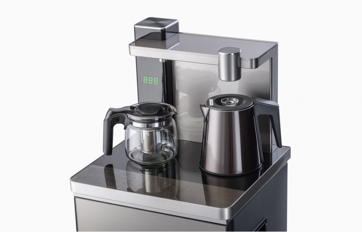 Оригинальное исполнение кулера с нижней загрузкой бутыли состоит из заварочного и электрического чайников, сенсорной панели управления, удобного крана подачи воды и шкафчика для хранения. Яркая световая индикация и информативный дисплей на сенсорной панели сообщат о текущем режиме и подключении к сети. Встроена защитная система от случайного нажатия и система подогрева заварного чайника, которая позволяет поддерживать температуру до 24 часов.