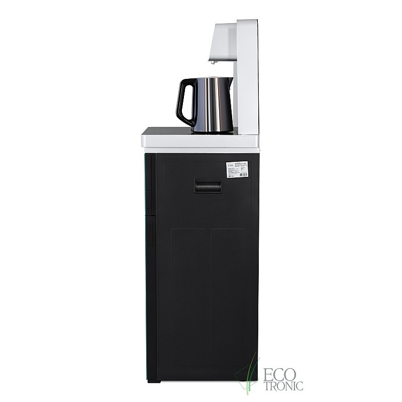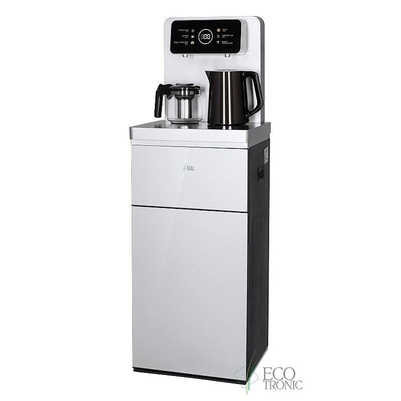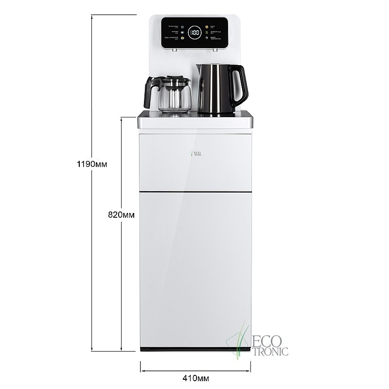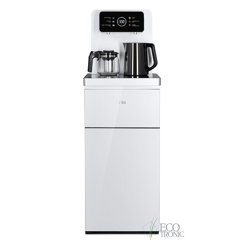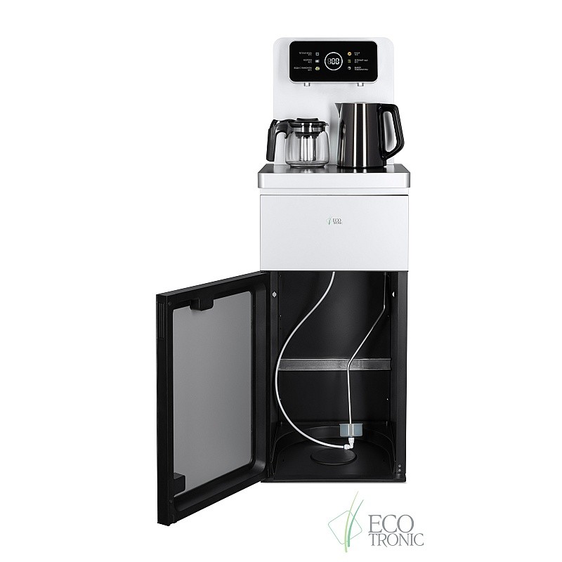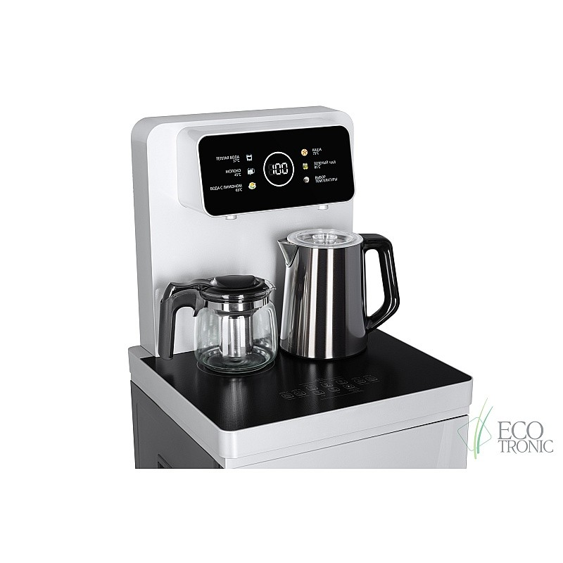 Тиабар Ecotronic TB19-LNR Arctic Grey — это напольный кулер с чайным столиком. Большая и удобная панель управления с возможностью задать температуру нагрева (5 режимов нагрева). Пульт дистанционного управления. Нижняя загрузка бутыли. Два чайника — для кипячения и заварочный. Без охлаждения, только нагрев и подача воды комнатной температуры. Нагрев воды в чайнике до 100°С. Шкафчик для хранения. Многофункциональный тиабар с пультом дистанционного управления, можно управлять аппаратом как на удаленном расстоянии до 7 метров, так и с помощью сенсорной панели управления на русском языке на столешнице. Матовая поверхность столешницы позволяет лучше поддерживать рабочую поверхность в чистоте. Верхняя часть представляет собой стойку с двумя кранами направленного типа, совмещенную с информационным дисплеем с индикацией работы аппарата.