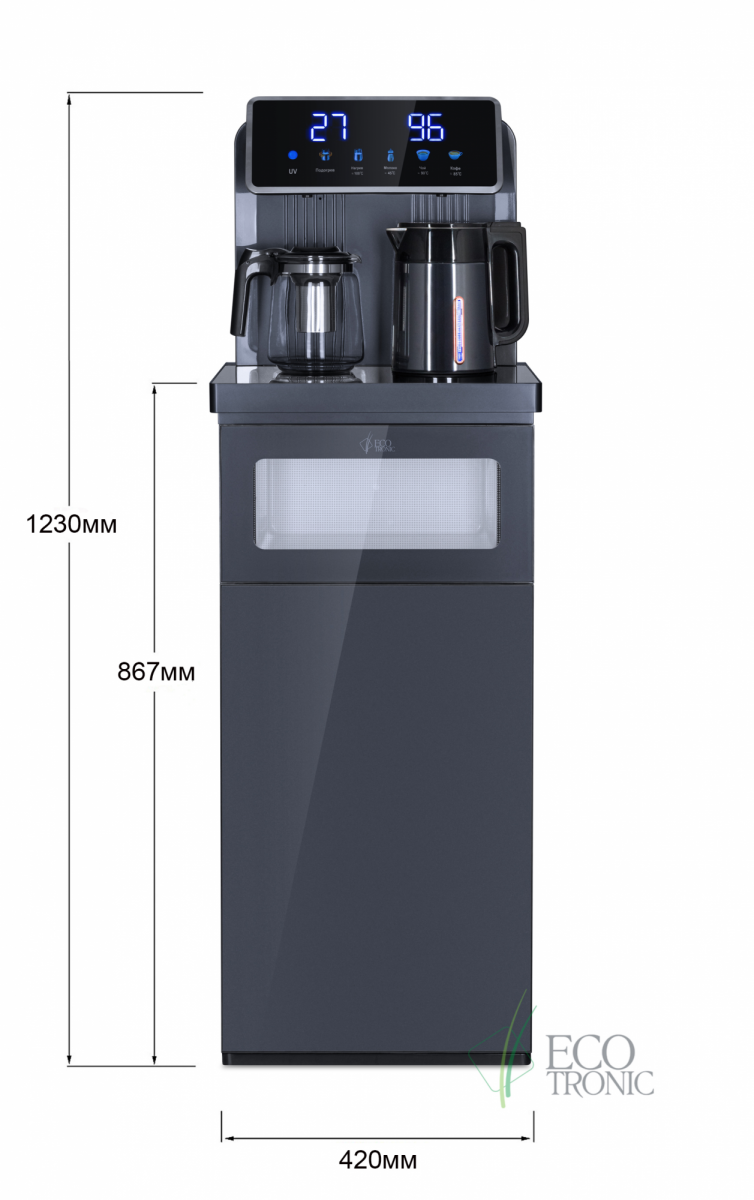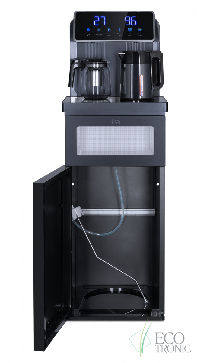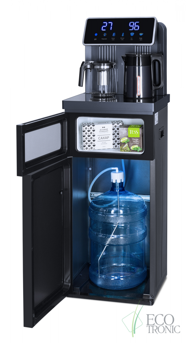 Тиабар Ecotronic TB30-LNR с UV-лампой в шкафчике — это напольный кулер с чайным столиком без охлаждения. Основные функции: дезинфекция, нагрев и подача воды комнатной температуры. Нагрев воды в чайнике до 100°С. В верхней части шкафчик для хранения
