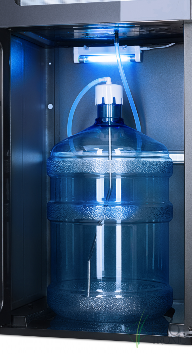 Функция дезинфекции воды ультрафиолетом: UV-лампа, расположенная в нижней части корпуса, в отсеке для бутыли, работает по схеме: первое включение функции — лампа работает 1 ч 45 мин., далее каждые 30 минут — автоматическое включение и отключение лампы.